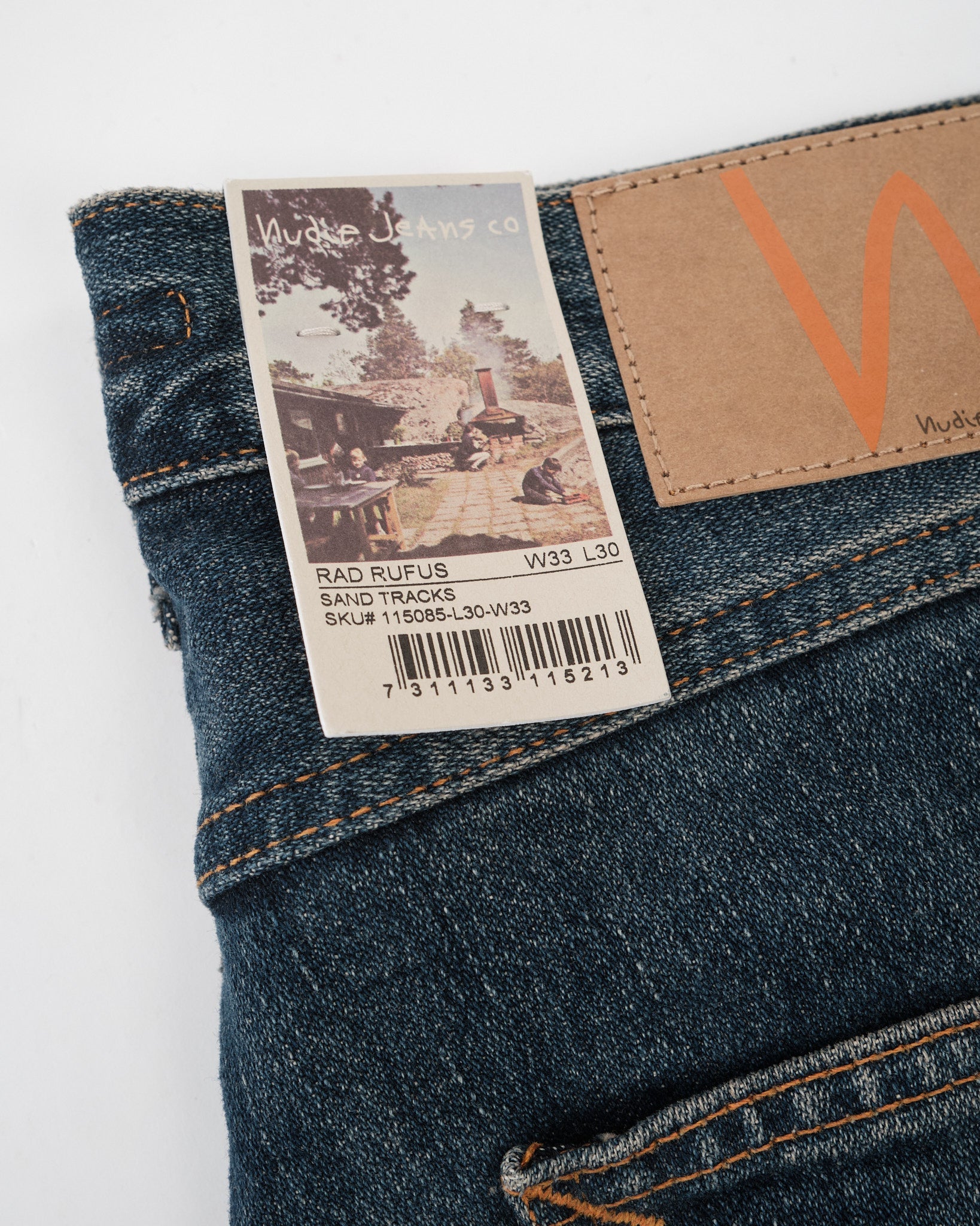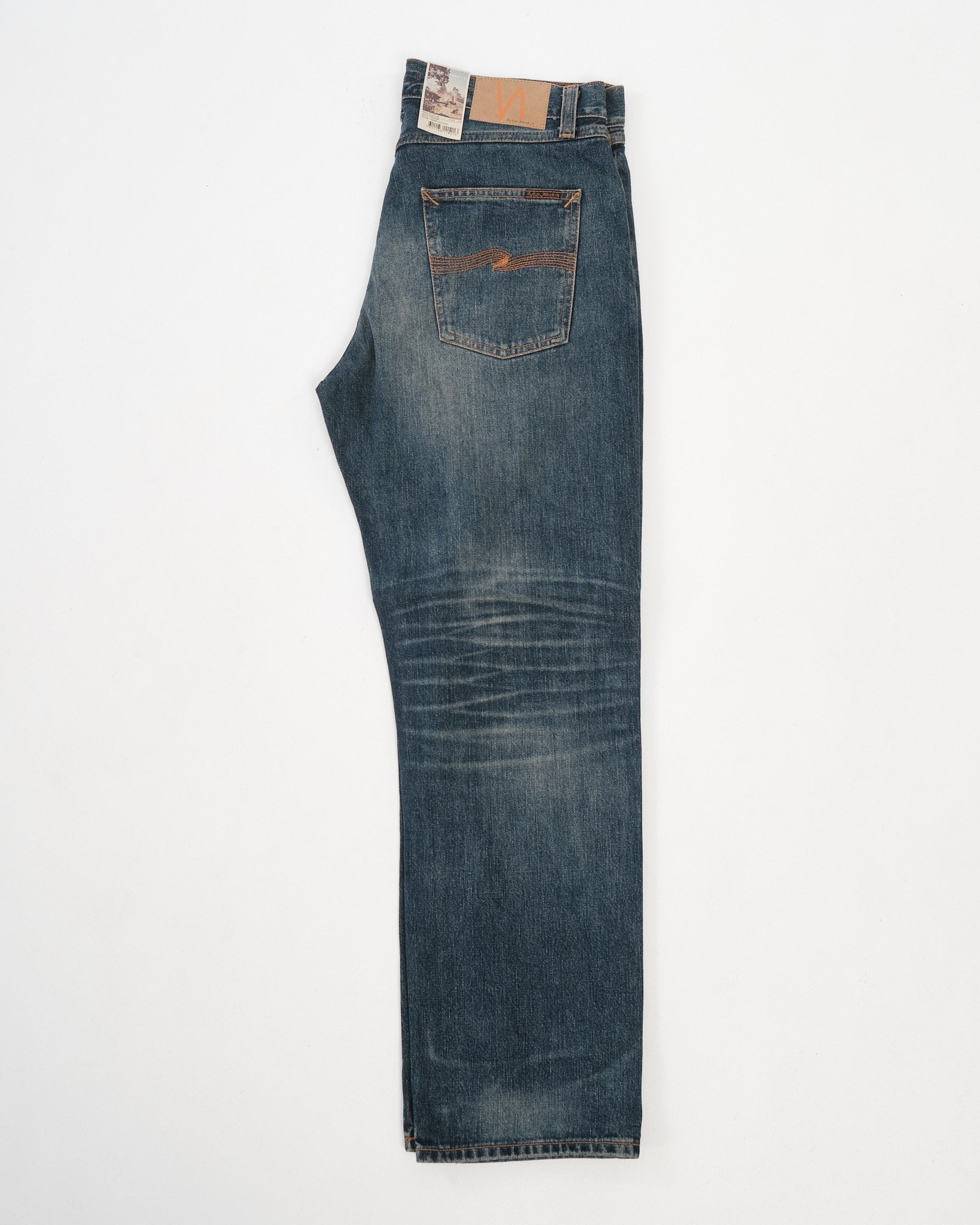 The Rad Rufus Sand Tracks are a faithful reproduction of the fades and wear patterns from an original, genuinely worn-in pair of Nudie Jeans. Using a precise recreation process, the character of the vintage reference has been captured and reworked onto a fresh pair, down to the placement and tone of the wear marks. Cut in Rad Rufus’ regular fit with a high waist and straight leg, they’re made from 13.75 oz rigid broken twill denim and washed to a deep, slightly greenish indigo with warm, high-contrast abrasion. The result is a textured, streaky denim with a coarse hand and a convincingly lived-in look—part of Nudie’s Life Tracks concept, where each wash is built around a real story.