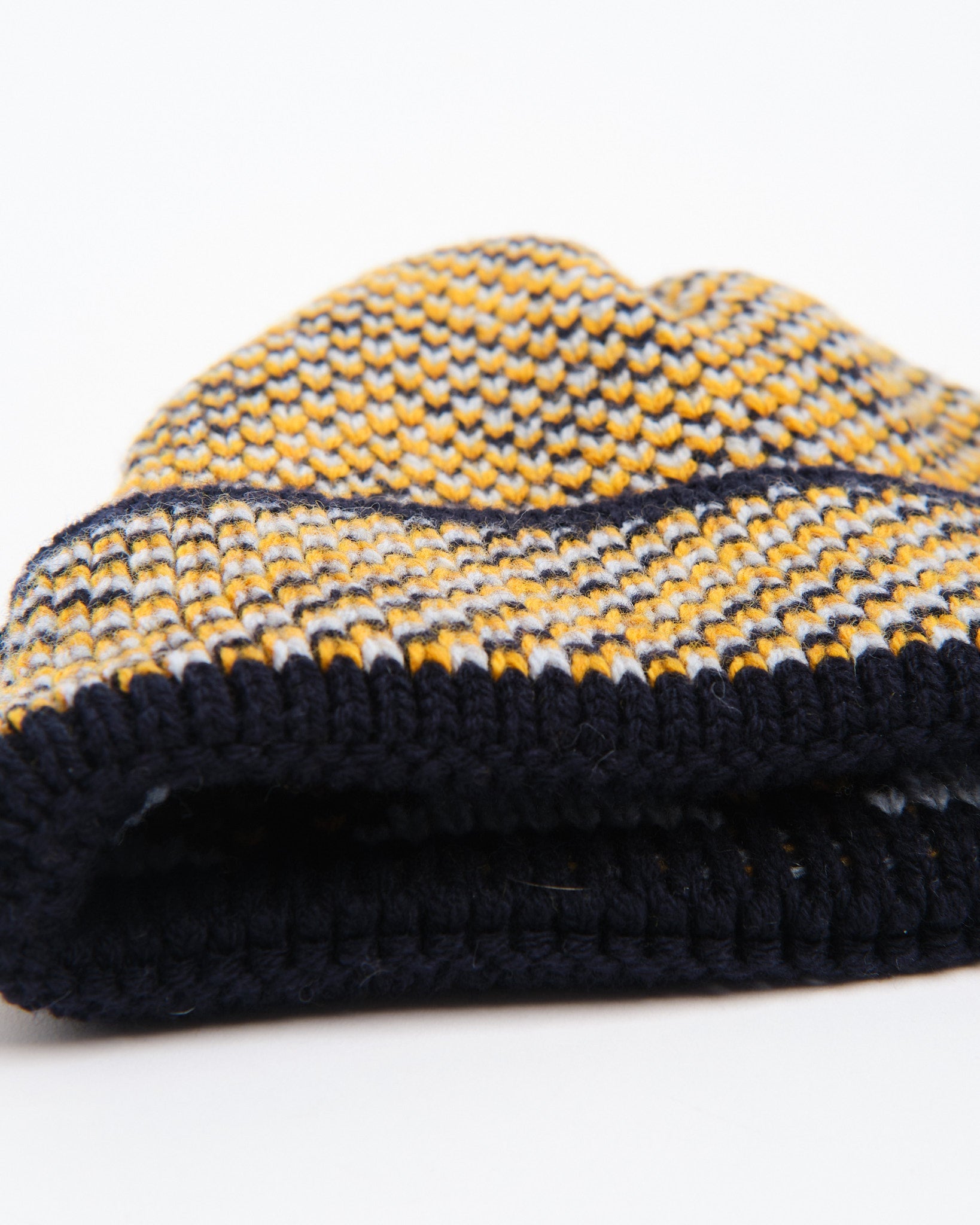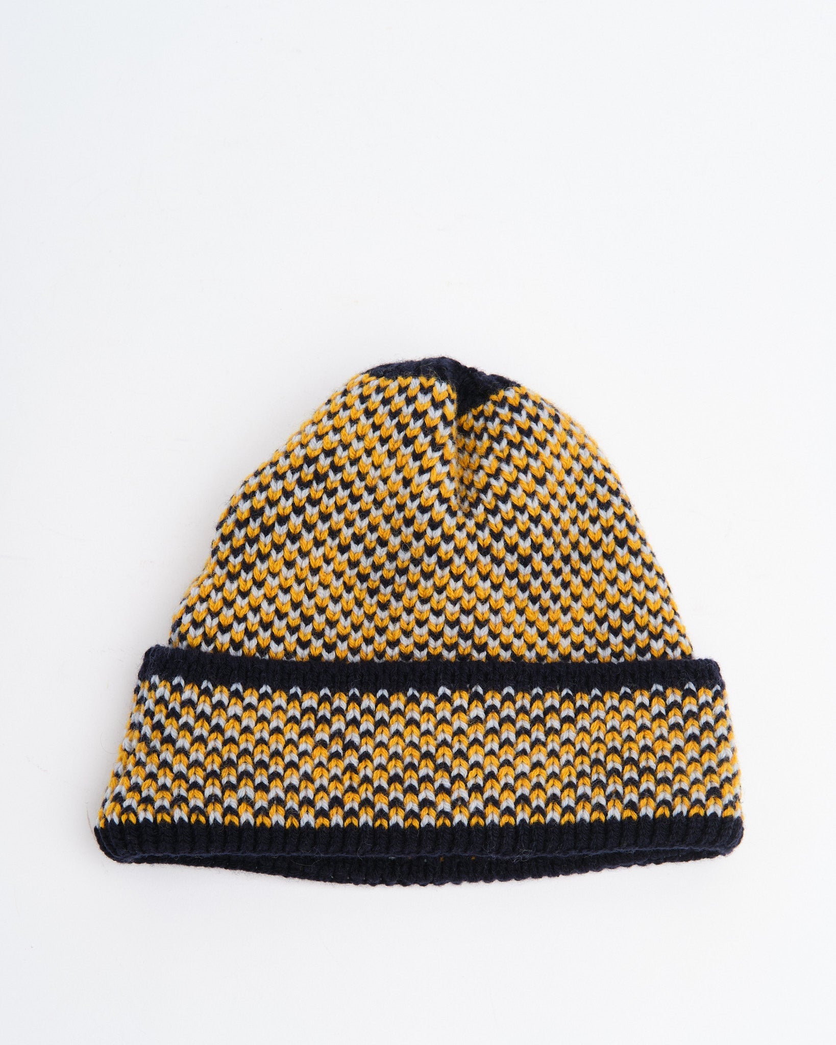 Reverse Geo Beanie tummansinisessä värissä Found Featherilta tuo graafista rakennetta ja kohotettua tekstuuria yhteen kompaktiin pakettiin. Valmistettu Japanissa pestävästä italialaisesta Donegal-villasta, siinä on rohkea käänteinen jacquard-neulekuvio, joka lisää ulottuvuutta ilman ylimääräistä massaa. Pehmeä venyvä lanka ja yhden paneelin rakenne tarjoavat sileän, turvallisen istuvuuden, kun taas säännöllinen 7 cm:n lieri antaa sille klassisen kosketuksen. Viimeistelty kudotulla etiketillä ja QR-koodatulla hoito-ohjeella, tämä pipo yhdistää päät kääntävän suunnittelun kylmän sään mukavuuteen.