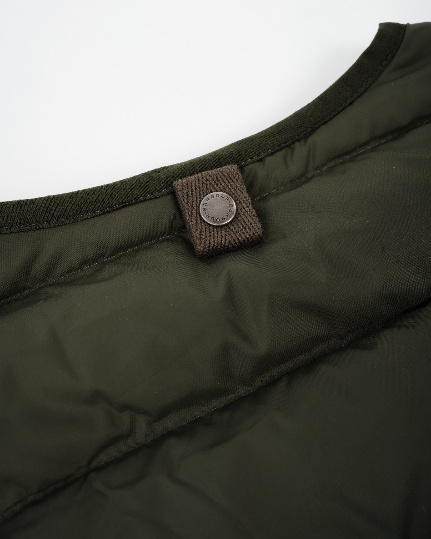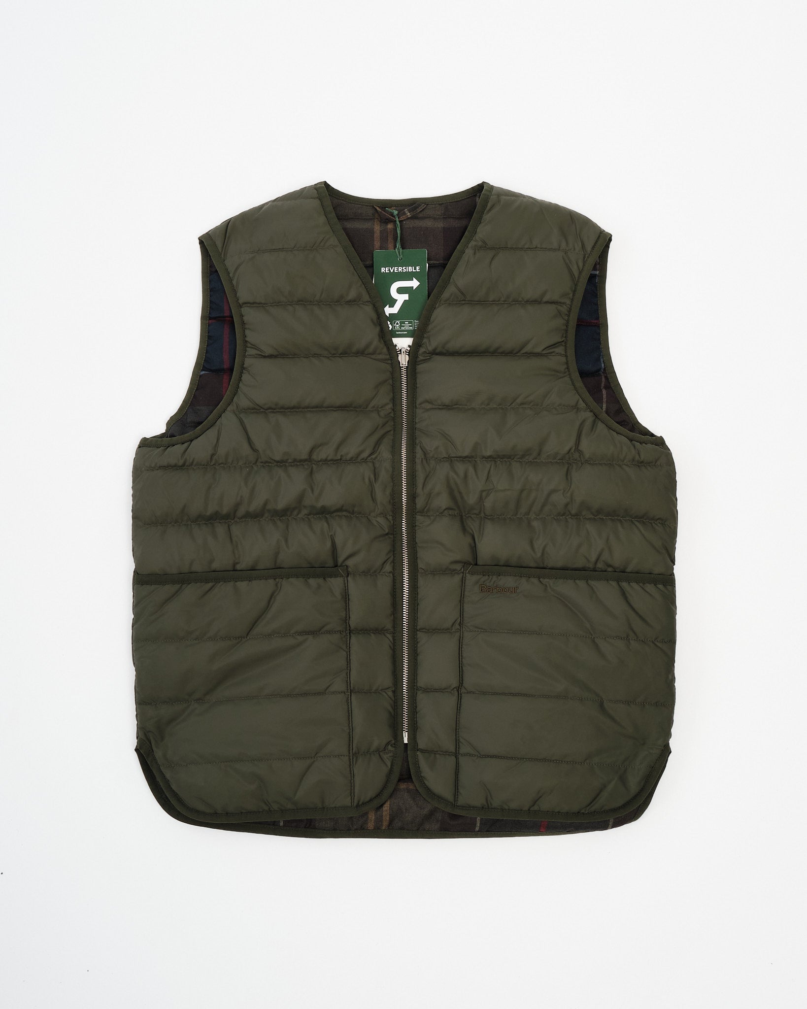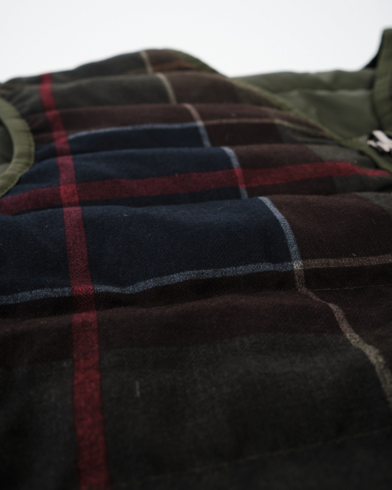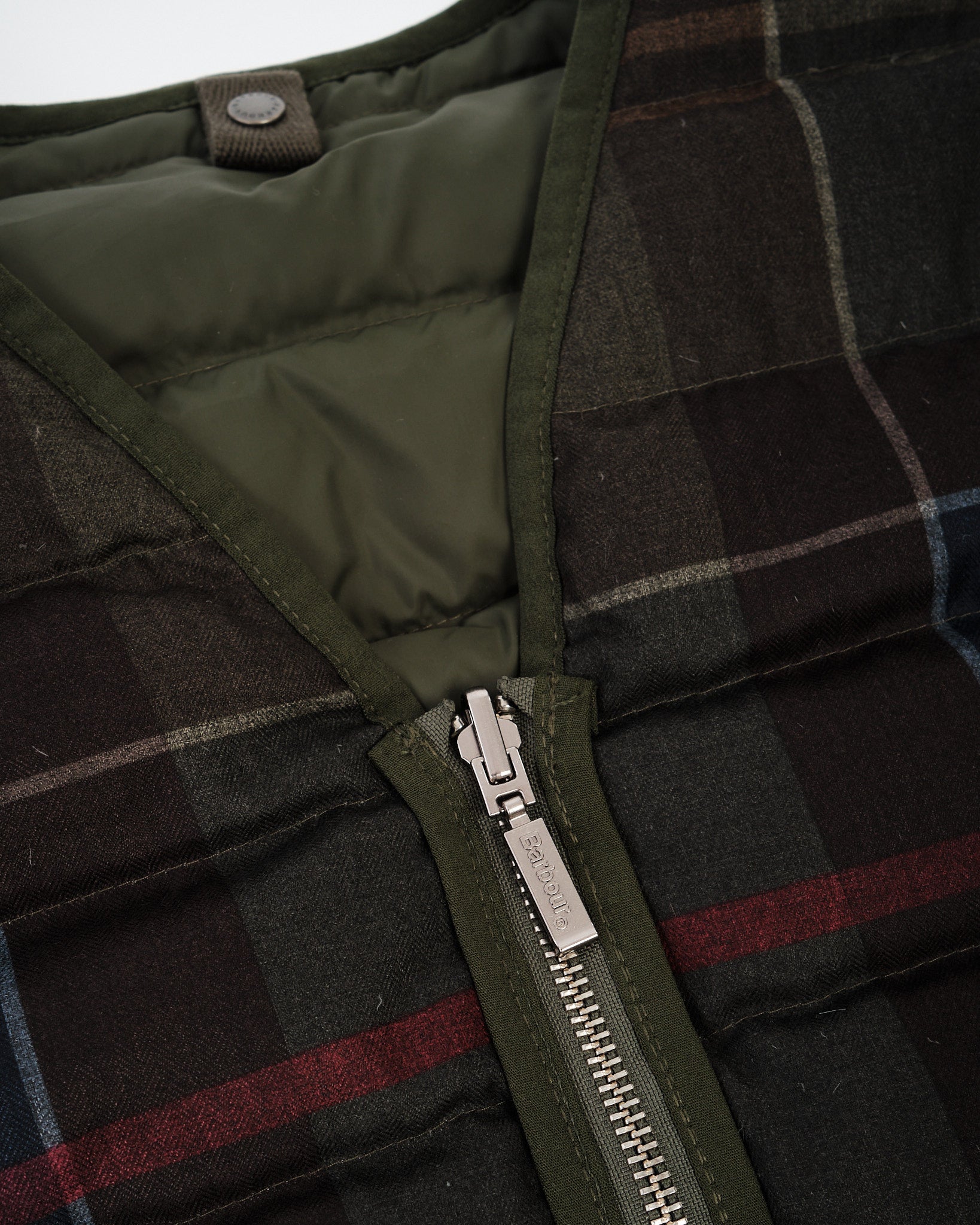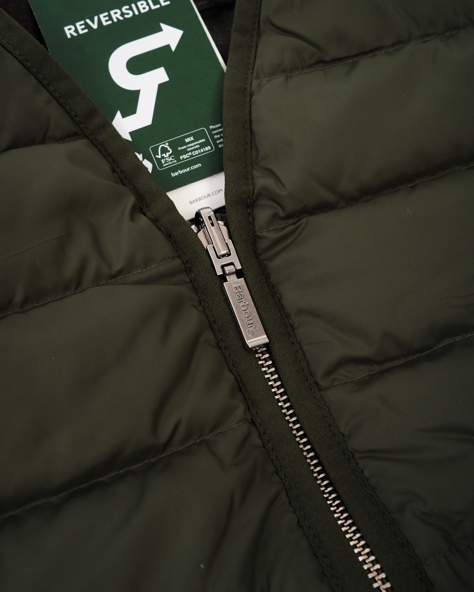 Kaksi ulkonäköä. Yksi olennainen kerros. Barbour Reversible Down Filled Liner värissä Sage on suunniteltu monipuolisuutta, lämpöä ja ajatonta toiminnallisuutta varten. Suunniteltu tikatulla polyesterikuorella, siinä on toinen puoli puhtaassa salvianvihreässä ja toinen klassisessa tartan-sisustuksessa.