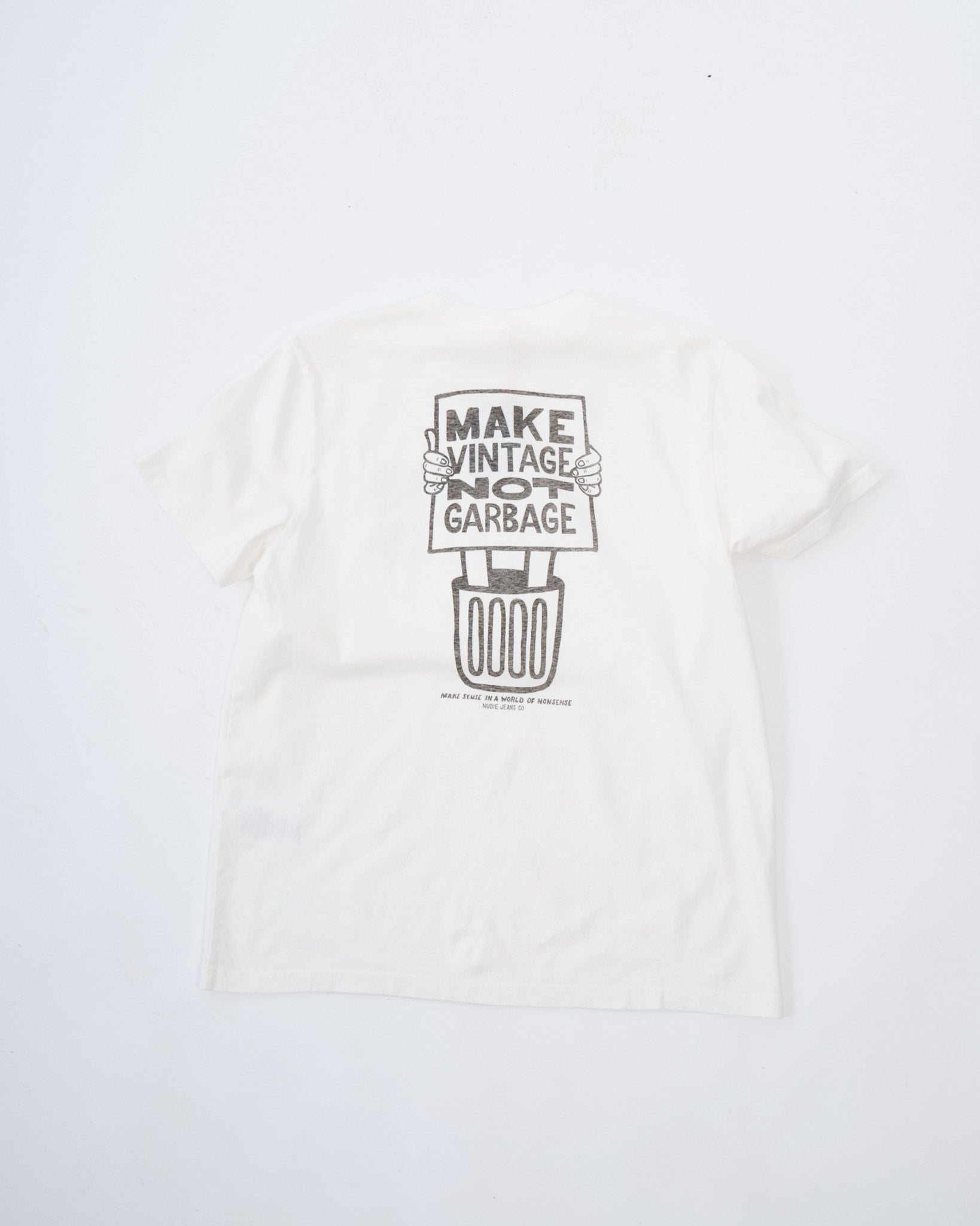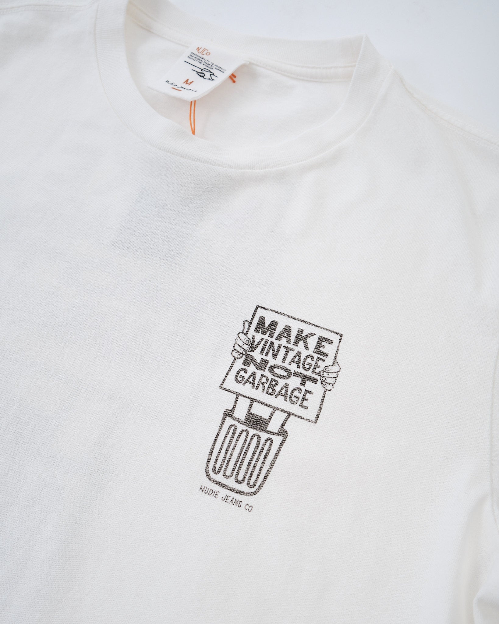 NUDIE JEANS CO. ROY GARBAGE T-PAITA CHALK WHITE on vintage-henkinen pyöreäkauluksinen t-paita, joka on suunniteltu luonnollisen kuluneen näköiseksi. Valmistettu 100% luomupuuvillasta, siinä on avopäinen kehrätty lanka, joka luo avoneuloksellisen rakenteen epäsäännöllisellä tekstuurilla, kuivan käsituntuman ja hienoisen karvaisuuden.