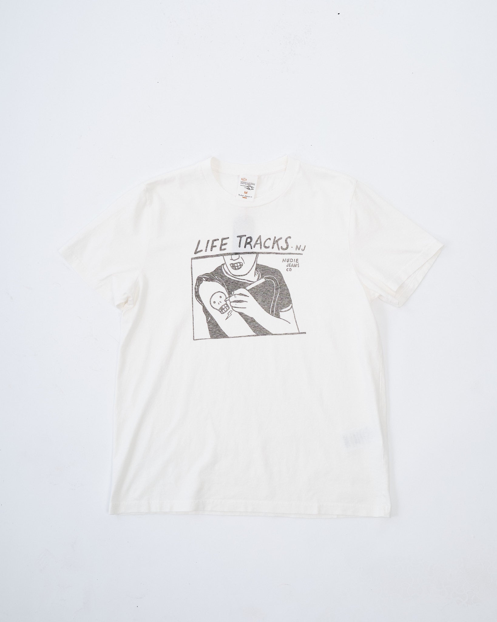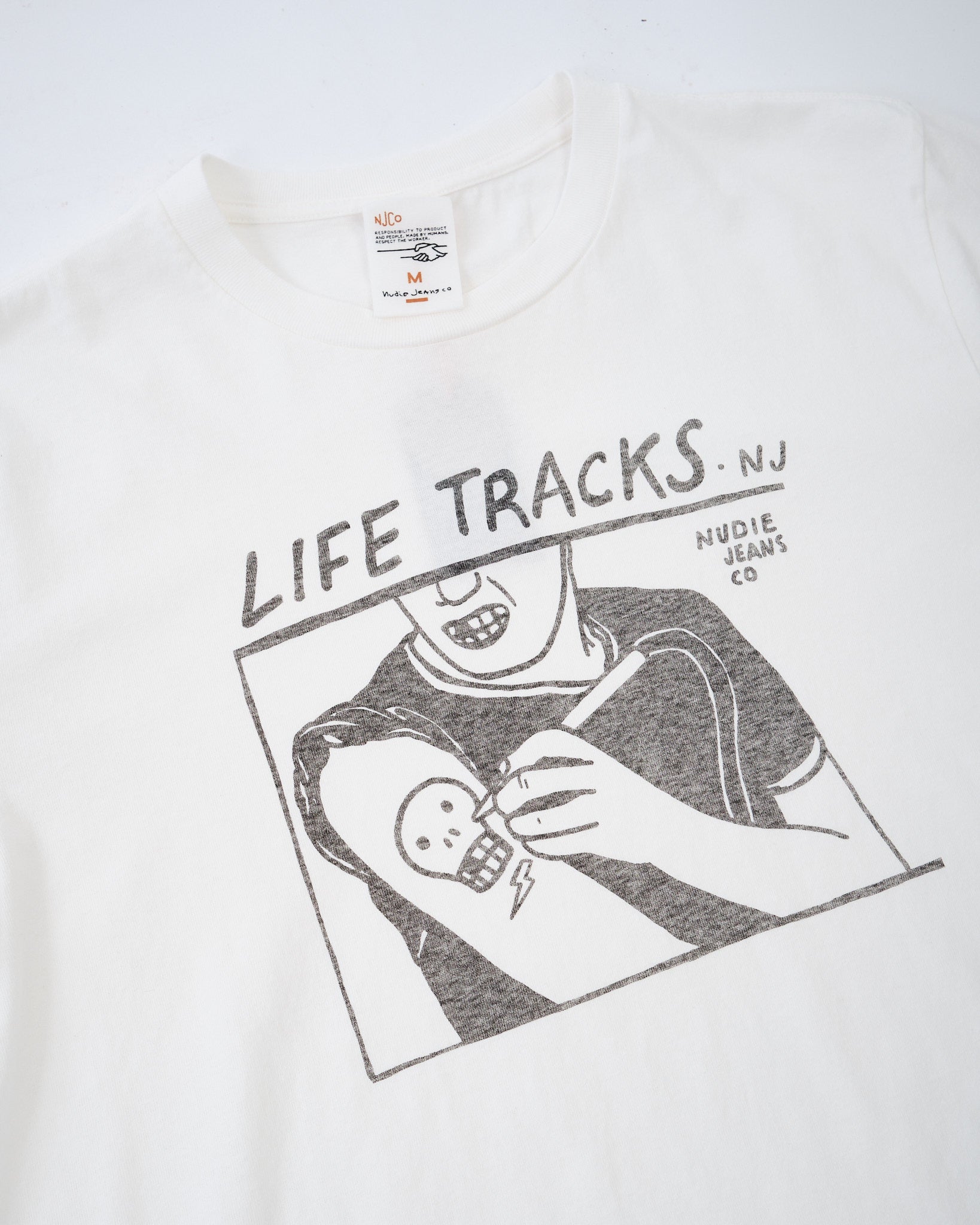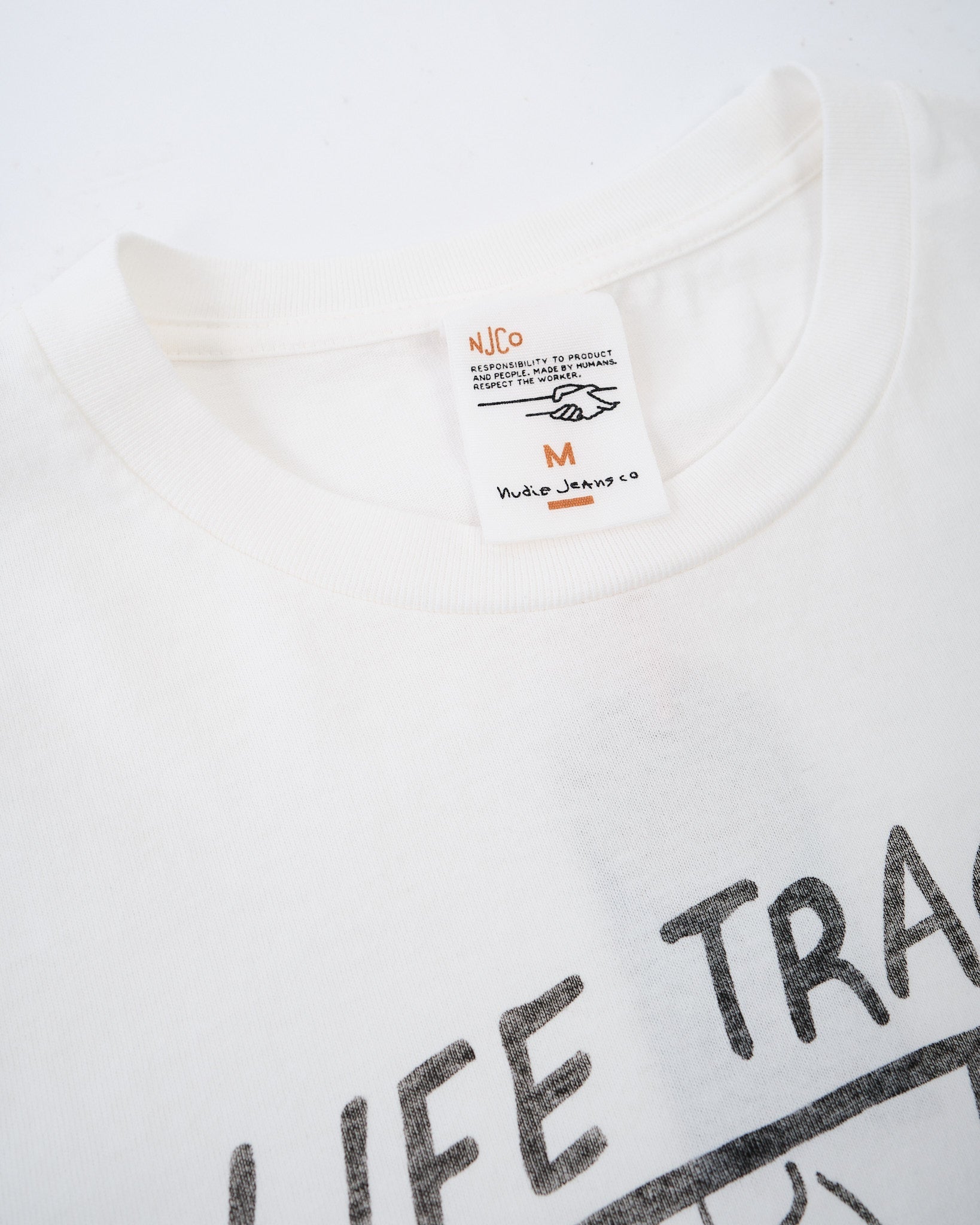 NUDIE JEANS CO. ROY LIFE TRACKS T-PAITA CHALK WHITE on klassinen miehistön kaula-aukkoinen t-paita, joka on suunniteltu rennolle, vintage-henkiselle ilmeelle. Valmistettu 100% luomupuuvillasta, siinä on avopäinen kehrätty lanka, luoden avoimen neulestruktuurin epäsäännöllisellä tekstuurilla, kuivan käden tuntumalla ja hienoisella karvaisuudella.