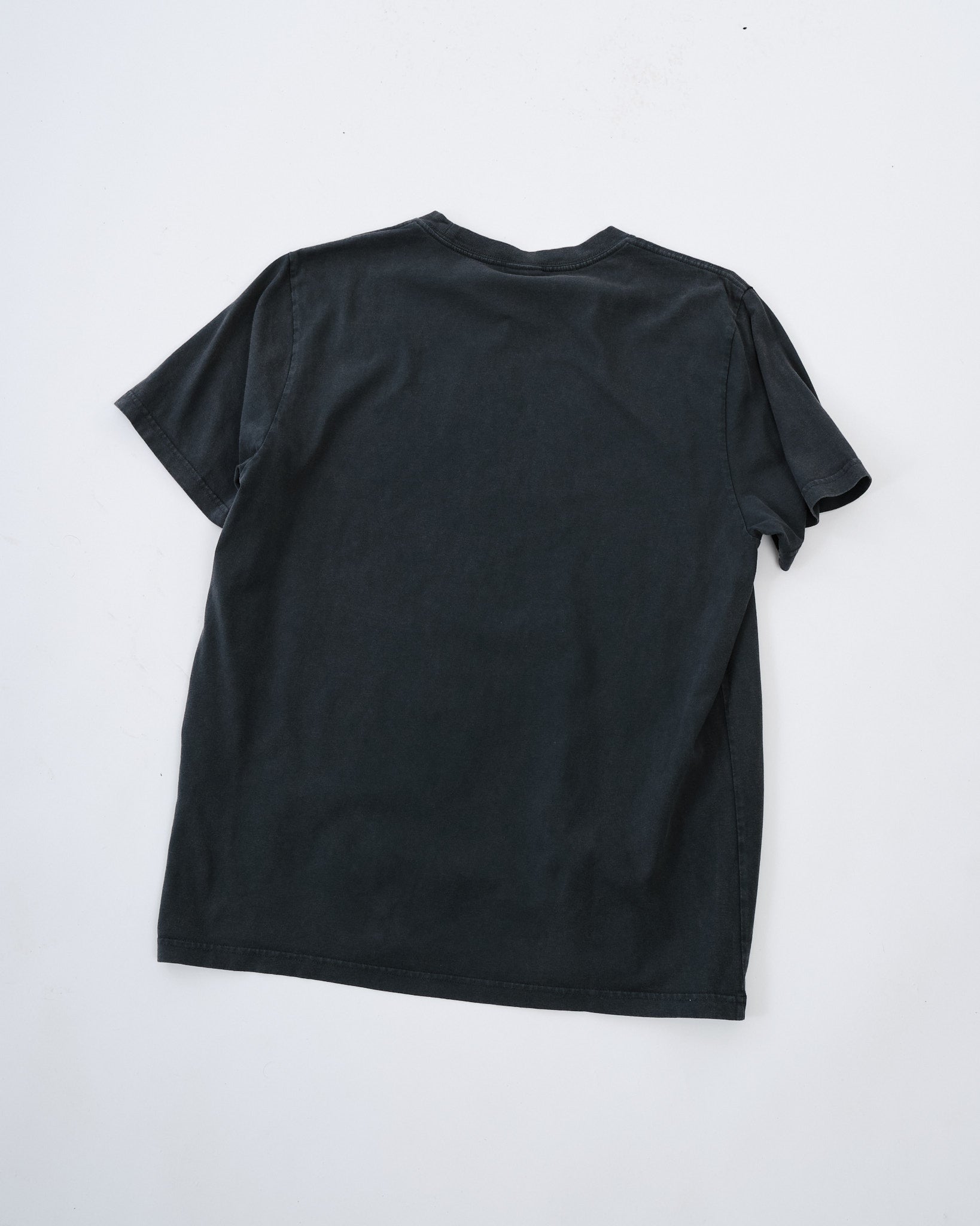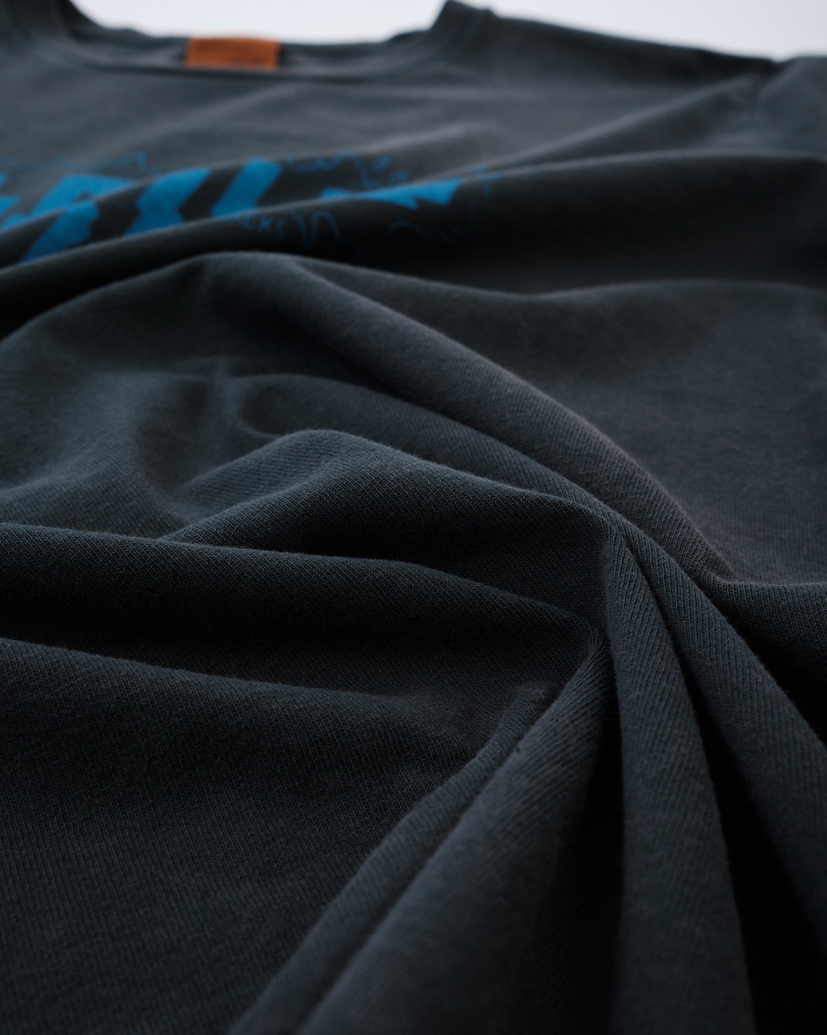 Haalistunut antrasiitin sävy saavutetaan vaatevärjäyksellä ja haalistavalla pesulla, mikä tuloksena on ainutlaatuinen eletyn näköinen estetiikka, joka sopii vaivattomasti yhteen farkkujen kanssa. Ajan myötä väri haalistuu edelleen, mikä lisää vintage-viehätystä. Viimeistelty rintapainatuksella, tämä t-paita tarjoaa rentoa, mutta erottuvaa tyyliä aidolla, kuluneella charmilla.
