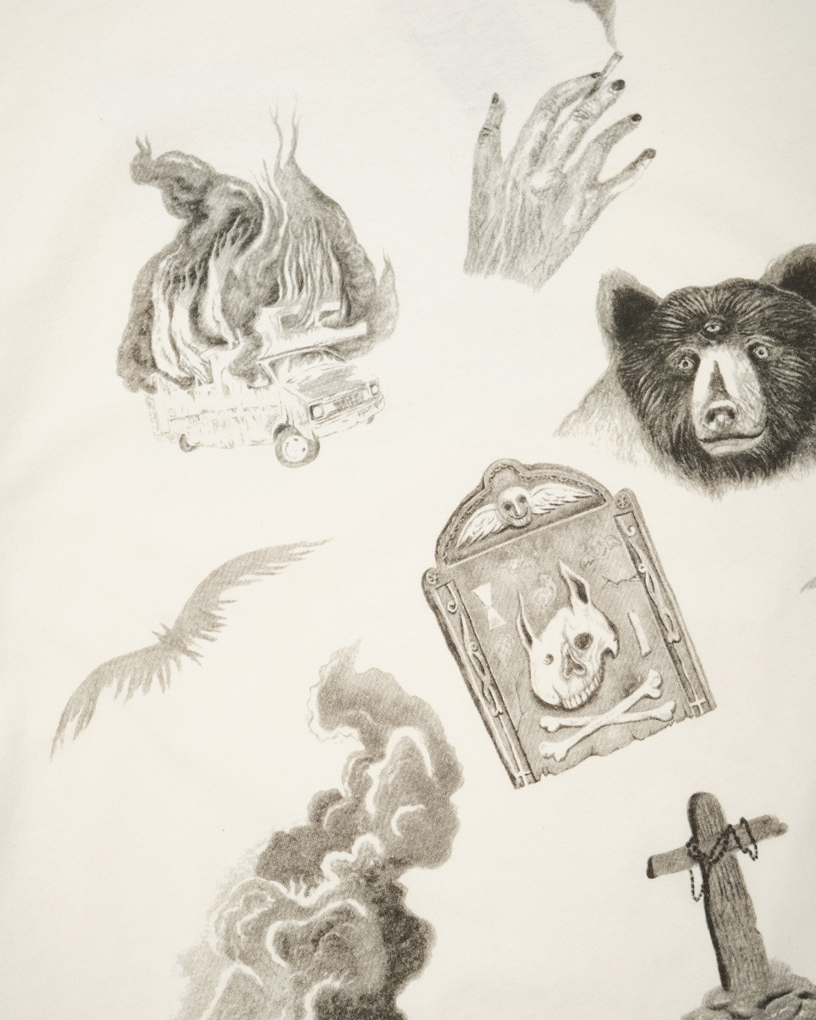 5. Vastakohtaiset yksityiskohdat: Harmaat tikkaukset täydentävät taideteoksen synkkää tunnelmaa, sitoen kappaleen visuaalisesti yhteen.