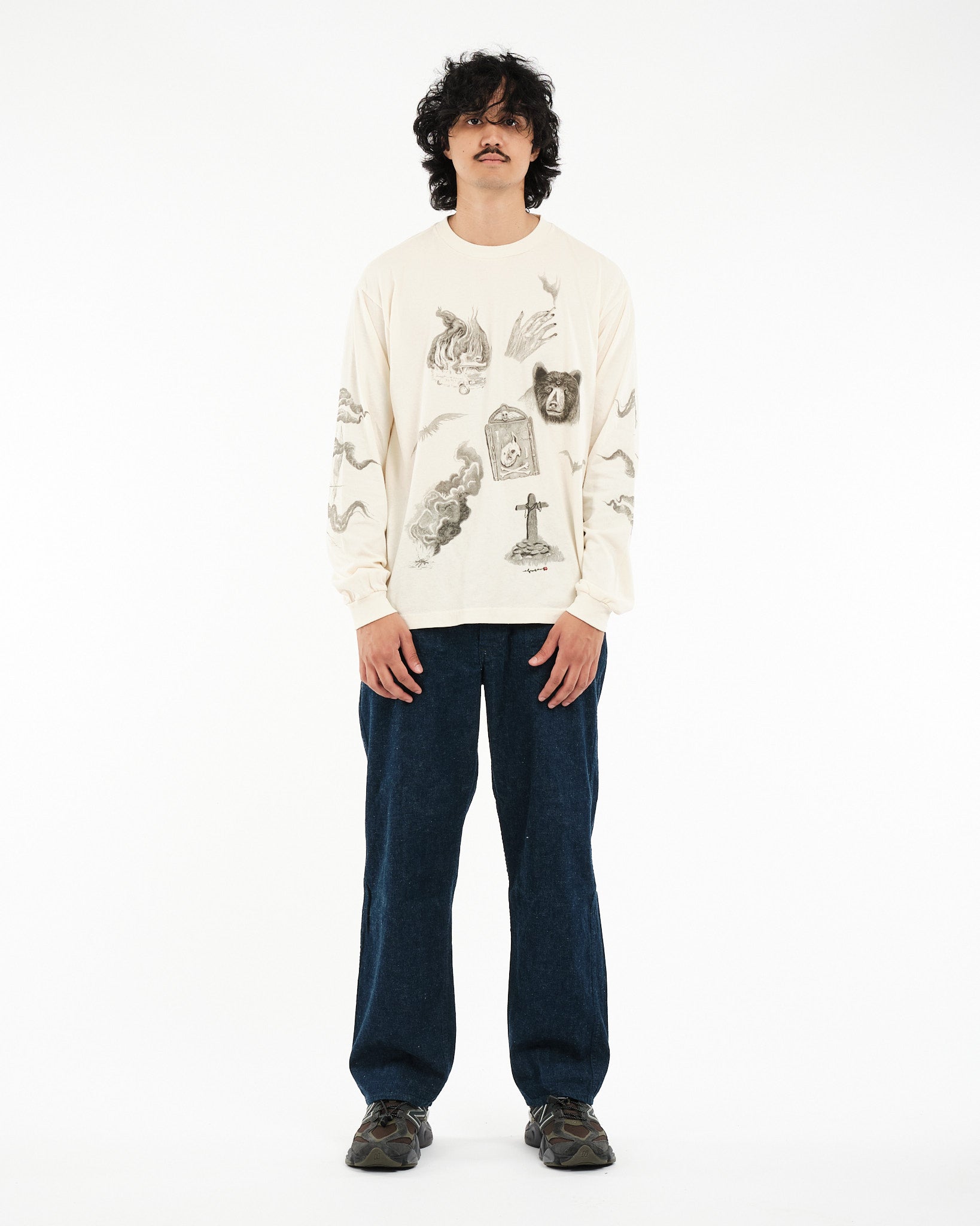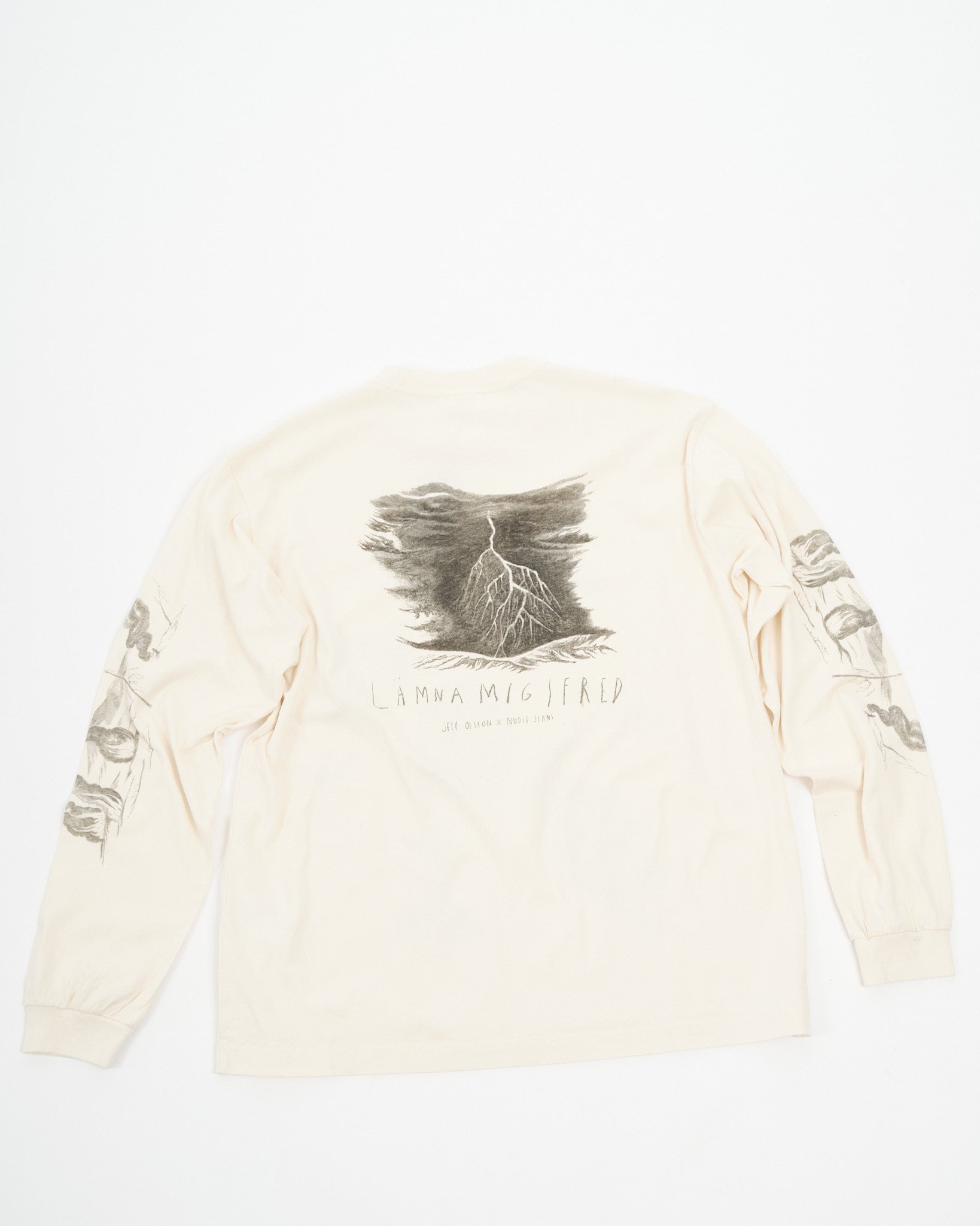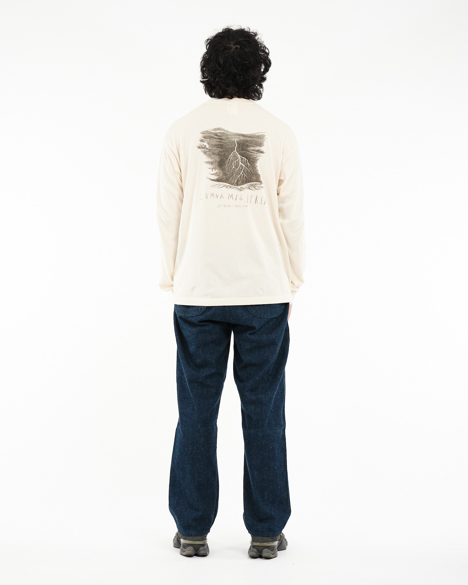 Arvostamme Nudie Jeans Co. Rudi Doodle Off White T-paidan luovuutta, jossa on esillä taiteilija Jeff Olssonin Gothenburgista käsialaa olevia alkuperäisiä suunnitelmia. Luomupuuvillasta valmistettu pitkähihainen miehistönkaulus t-paita sisältää lumoavan kokoelman lyijykynäpiirroksia, joista jokainen on pieni taideteos heijastaen Olssonin erottuvaa kosketusta melankoliaan ja syvyyteen. Ruotsalainen lause "Leave me alone" on tyylikkäästi esitetty takana lisäten flairia suunnitteluun. Paidan tekstuuri on rikastettu neuloksen ja renkaalla kehrätyn langan lievän nukkaisuuden myötä harmailla päällitikkauksilla, jotka korostavat sen taiteellista viehätystä.