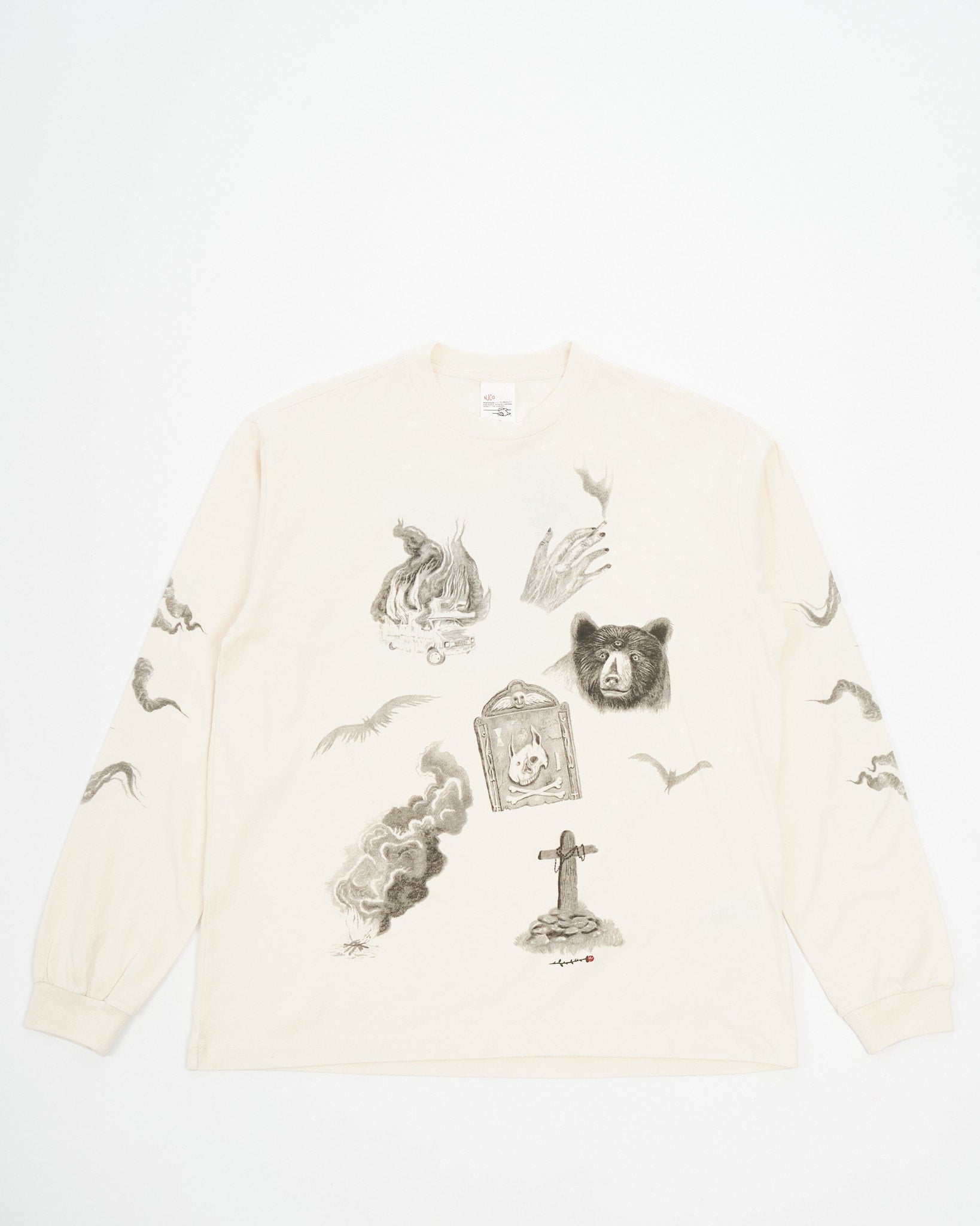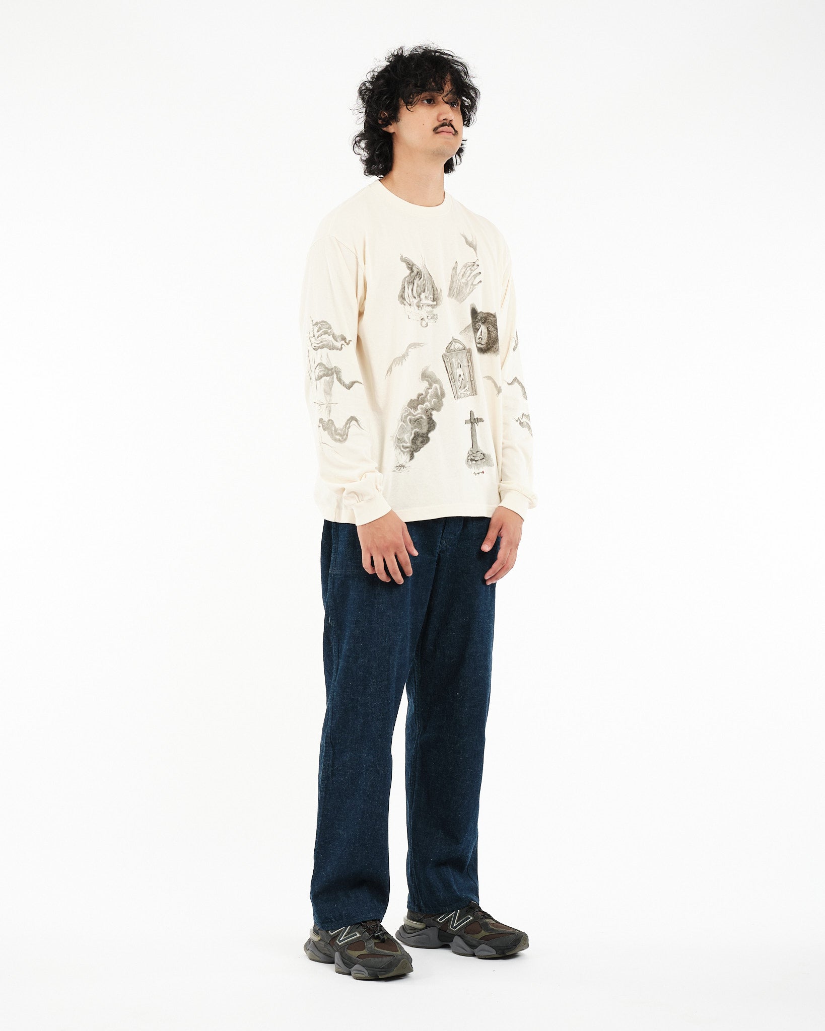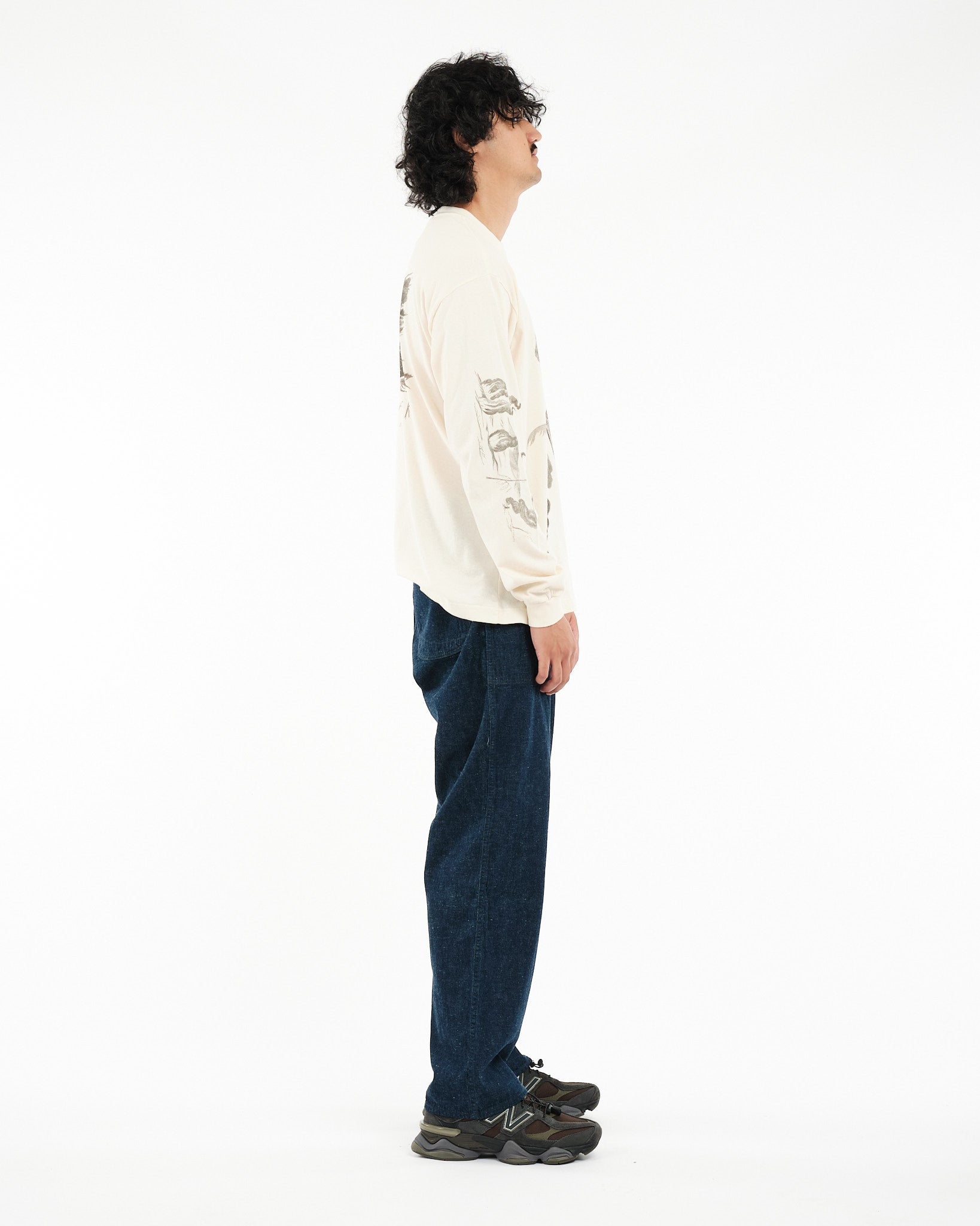 Arvostamme Nudie Jeans Co. Rudi Doodle Off White T-paidan luovuutta, jossa on esillä taiteilija Jeff Olssonin Gothenburgista käsialaa olevia alkuperäisiä suunnitelmia. Luomupuuvillasta valmistettu pitkähihainen miehistönkaulus t-paita sisältää lumoavan kokoelman lyijykynäpiirroksia, joista jokainen on pieni taideteos heijastaen Olssonin erottuvaa kosketusta melankoliaan ja syvyyteen. Ruotsalainen lause "Leave me alone" on tyylikkäästi esitetty takana lisäten flairia suunnitteluun. Paidan tekstuuri on rikastettu neuloksen ja renkaalla kehrätyn langan lievän nukkaisuuden myötä harmailla päällitikkauksilla, jotka korostavat sen taiteellista viehätystä.