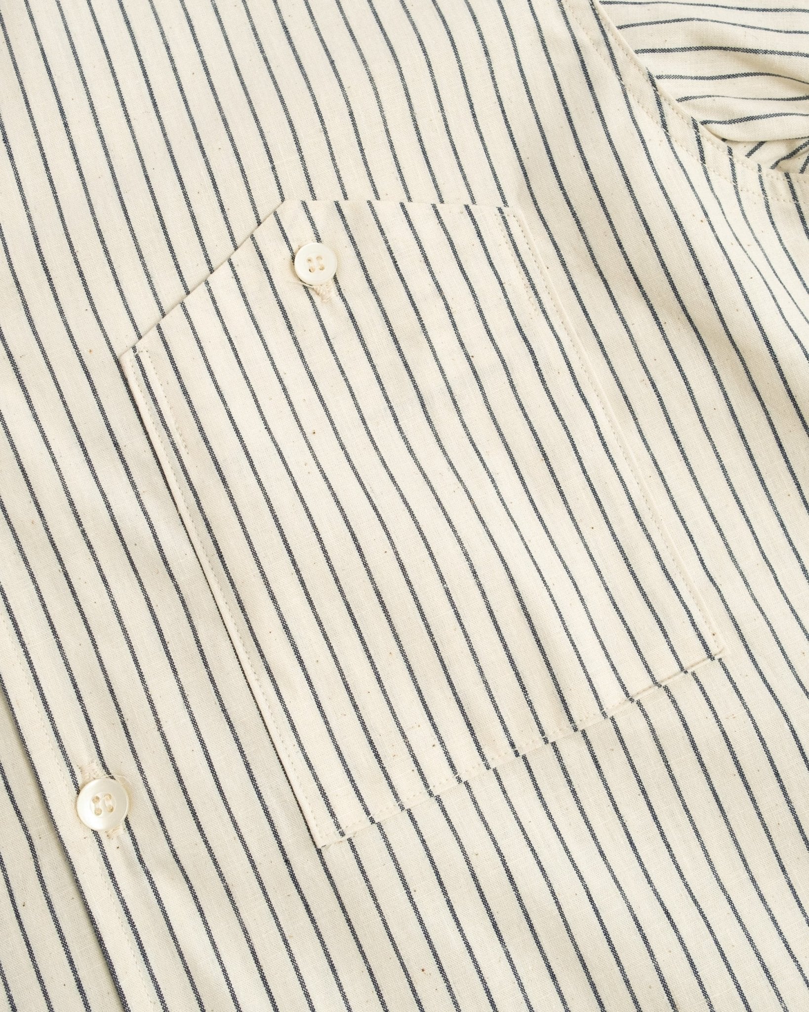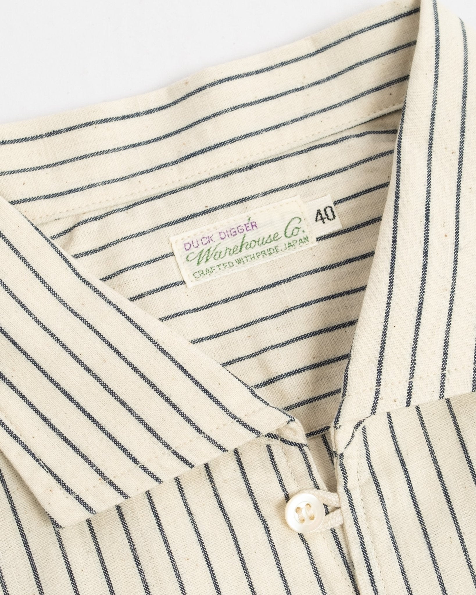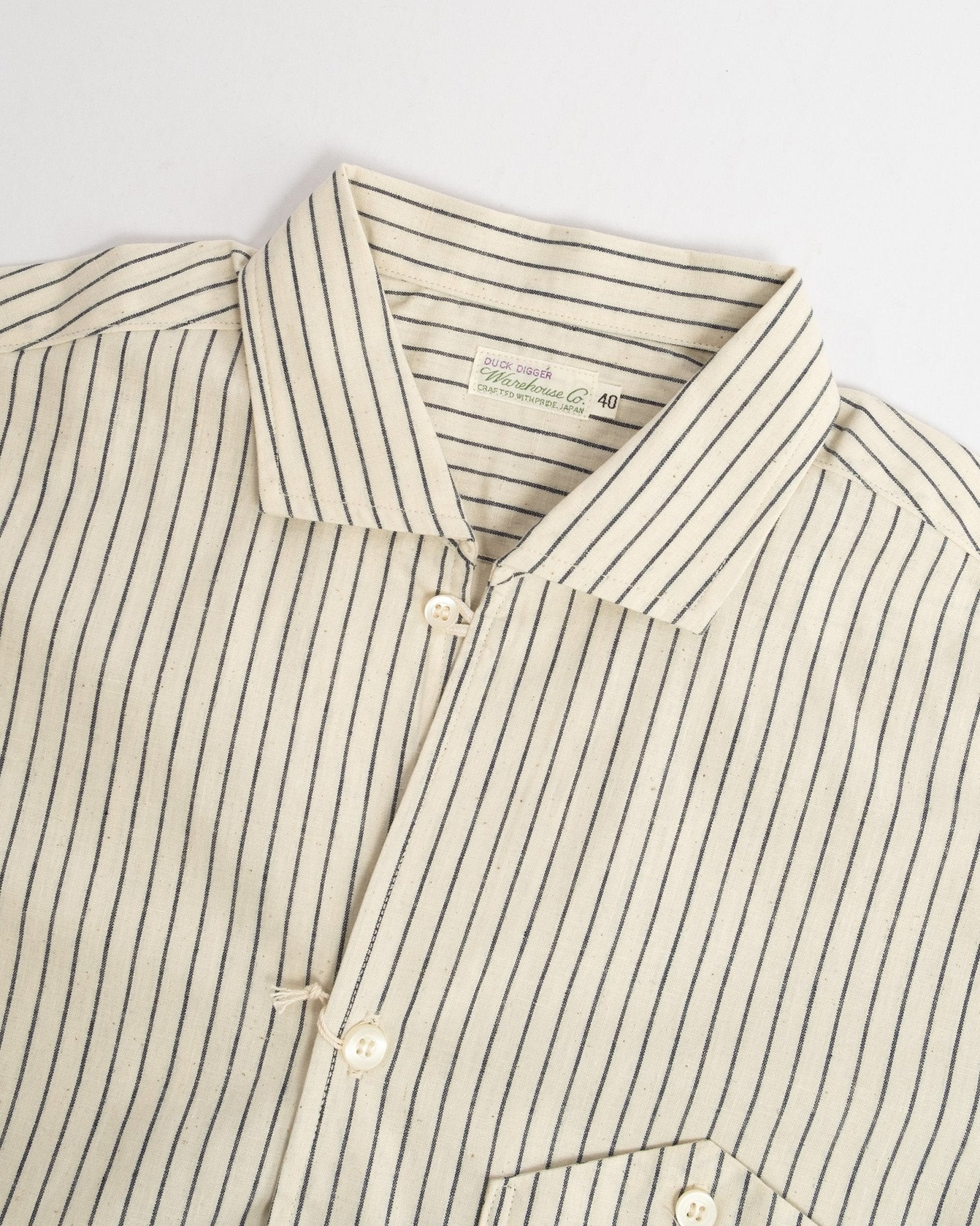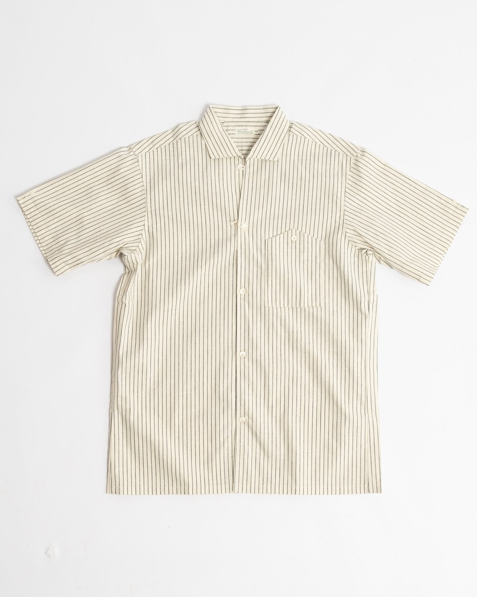 Lyhythihainen avokauluspaita Warehouse & Co:lta. Valmistettu raidallisesta ecru-puuvillakankaasta, joka on huolellisesti valmistettu Japanissa. Ominaisuuksina yksi rintatasku napillisella suljennalla.