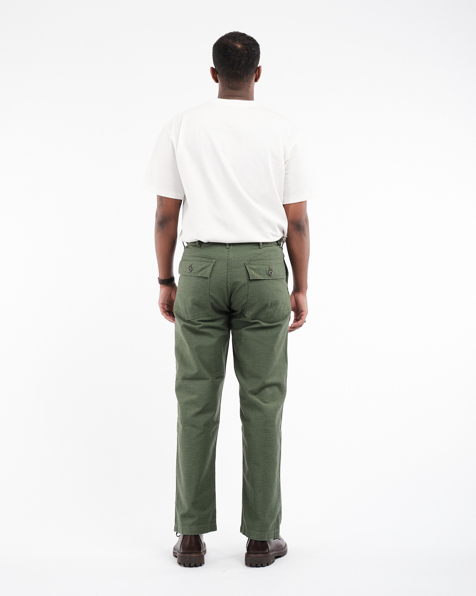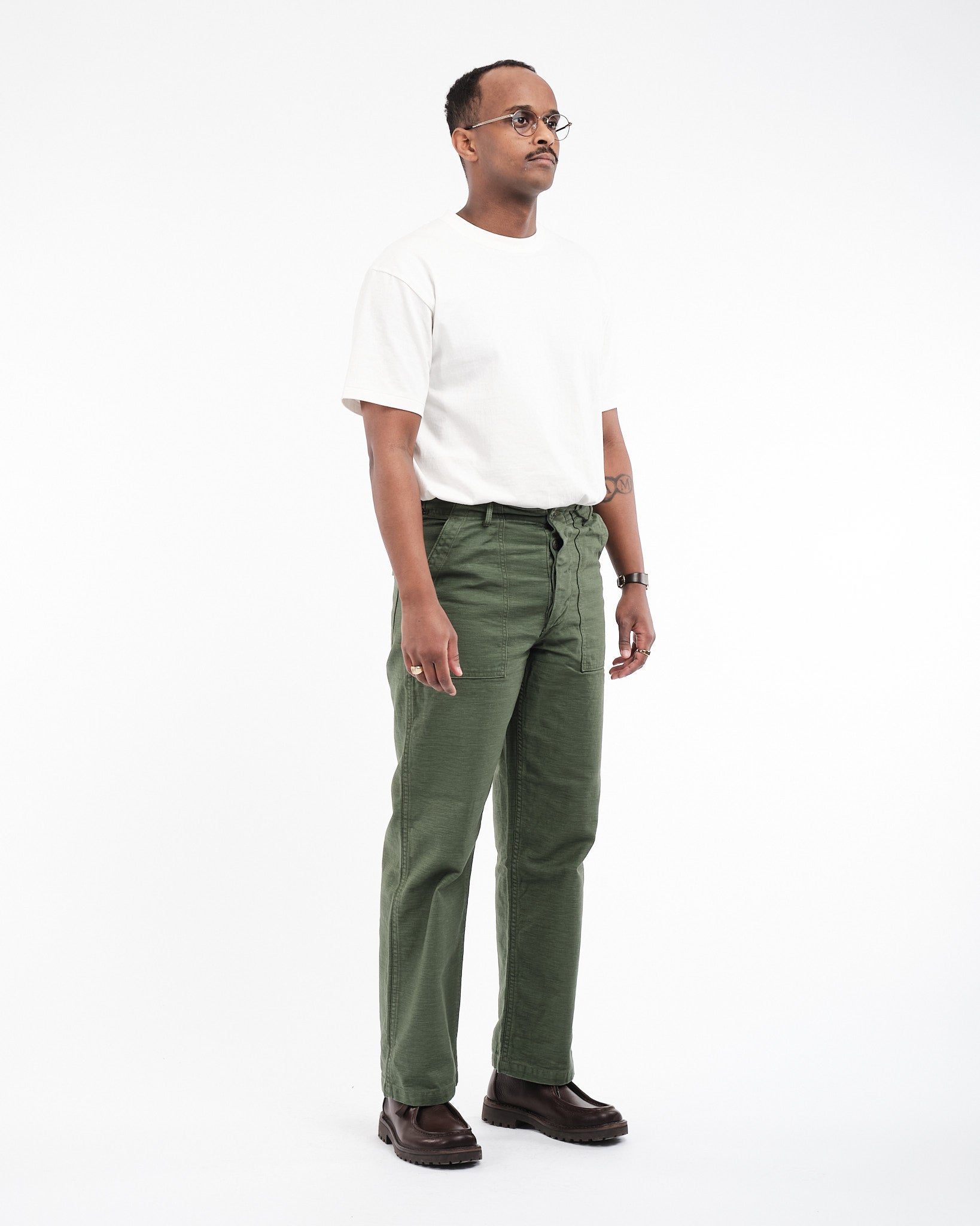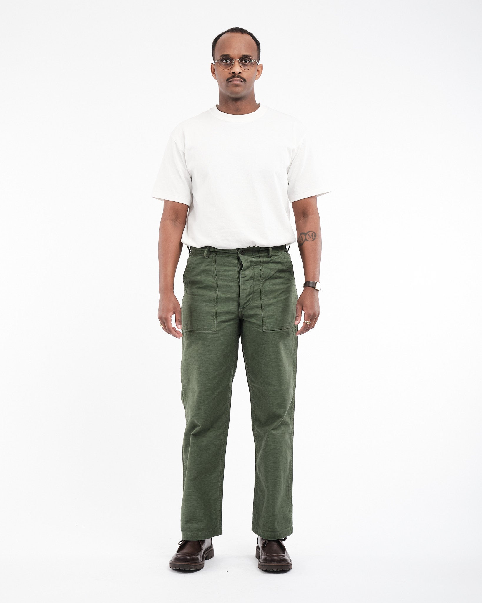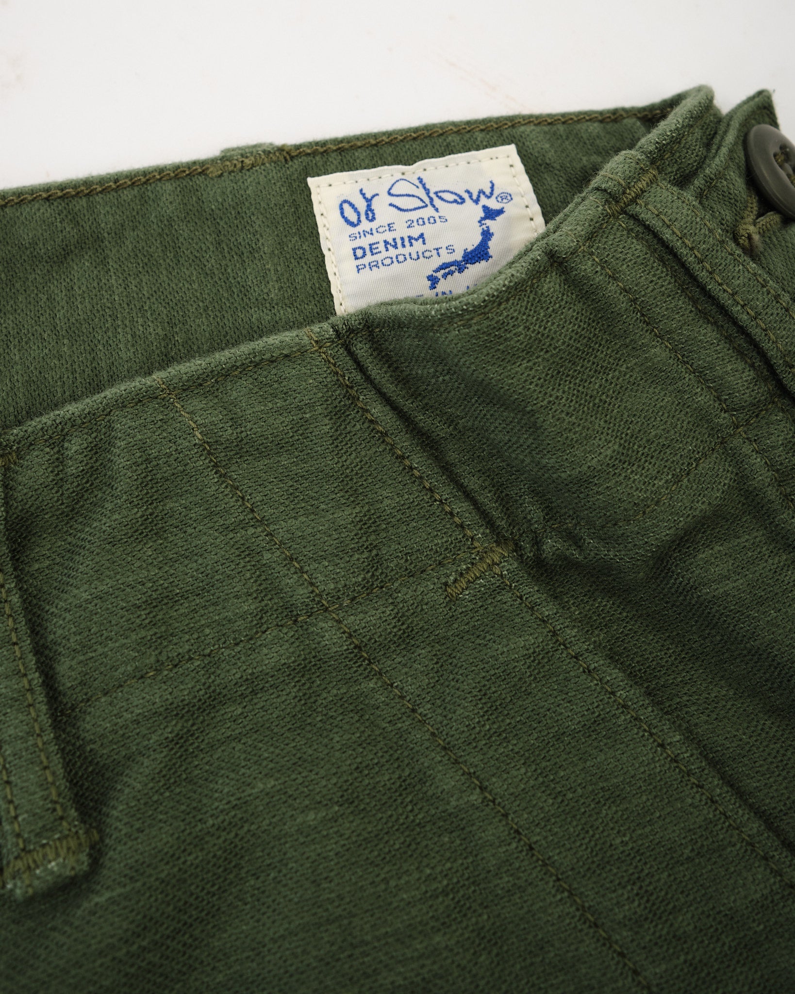 Koe ajattoman viehätyksen uudelleenkeksiminen orSlow Slim Fit Fatigue -housuilla, jotka ovat vihreän sävyiset. Japanissa huolellisesti valmistetut housut kunnioittavat klassista sotilassuunnittelua käänteisestä satiinista valmistettuina. Kestävästä 100% puuvillatvillistä valmistetut housut yhdistävät utilitaristiset elementit moderniin kosketukseen. Odota sivutaskuja, vyötärönauhaa, joka kiristetään välilehdillä, ja kapeaa istuvuutta, joka korostaa nykyaikaista siluettia. Olipa yhdistetty haalistuneeseen farkkutakkiin tai mukavaan villapaitaan, nämä housut huokuvat tyyliä yhdistettynä vertaansa vailla olevaan mukavuuteen.