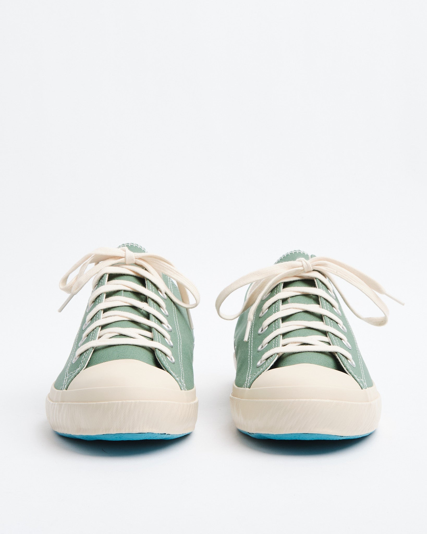 The Shoes Like Pottery SLP01 JP Green is a Japanese-made canvas sneaker crafted using time-honoured vulcanisation techniques in Kurume, Japan — a region known for its long shoemaking tradition. Each pair is slow-fired in a kiln, a rare process that enhances flexibility, durability, and long-term comfort.