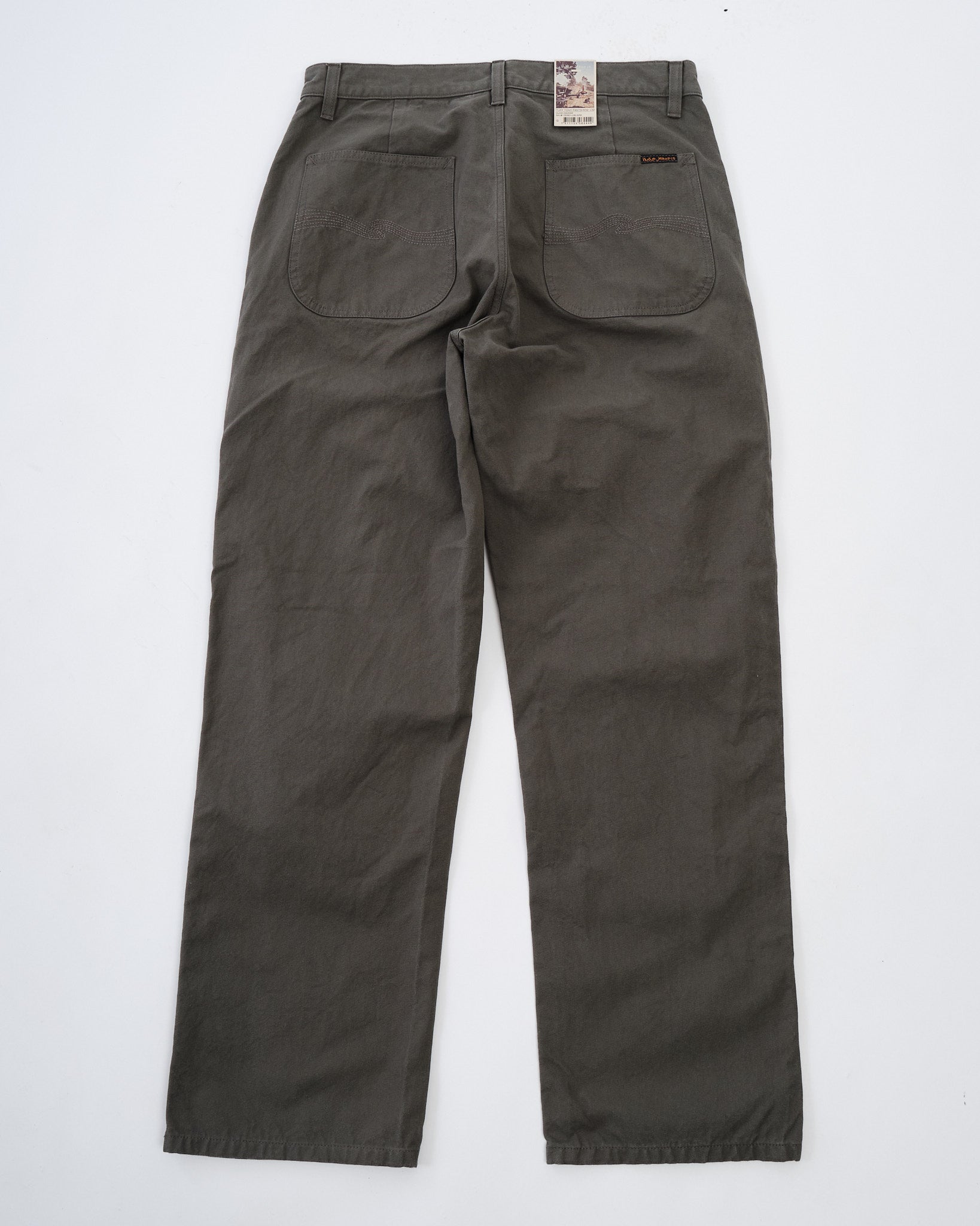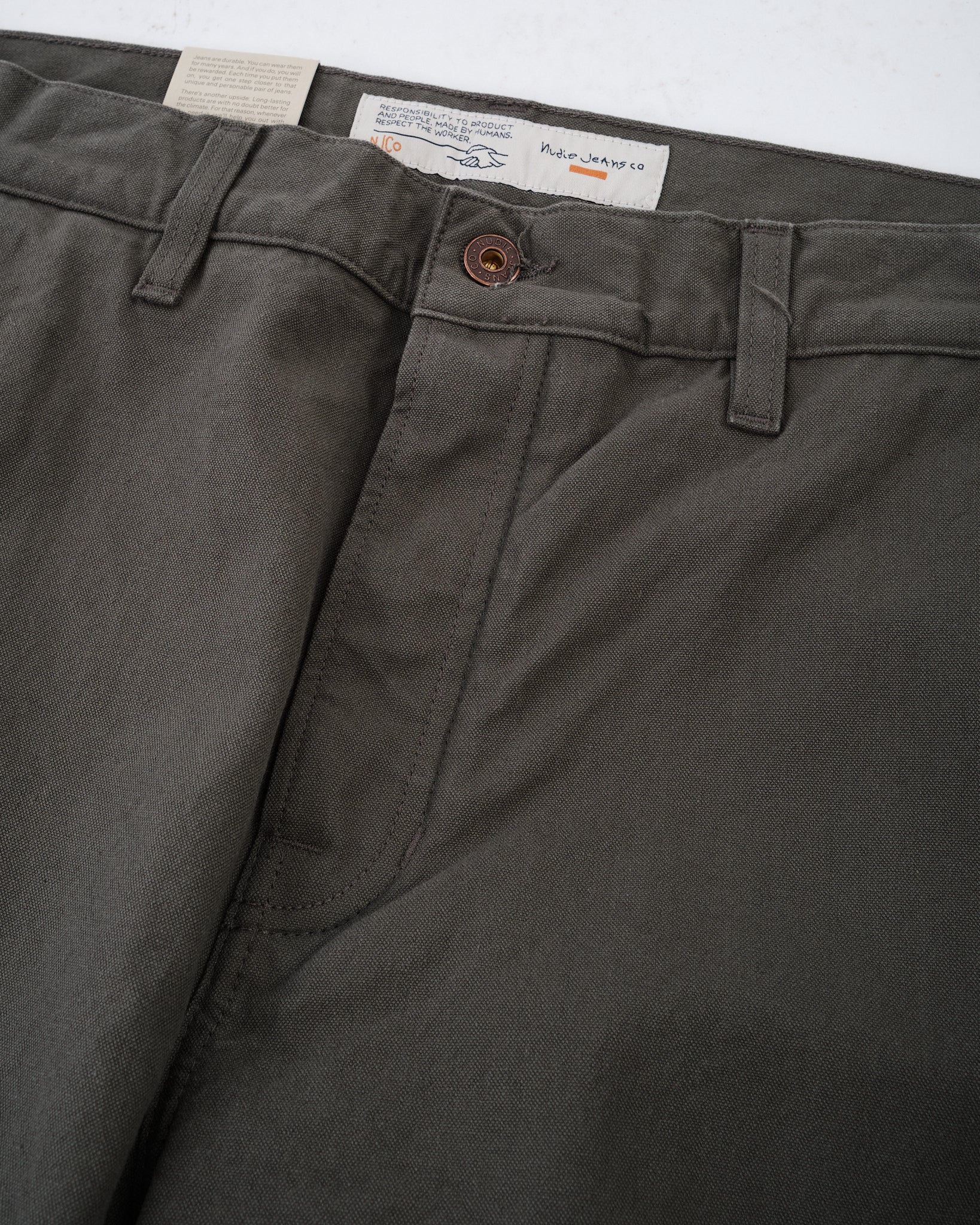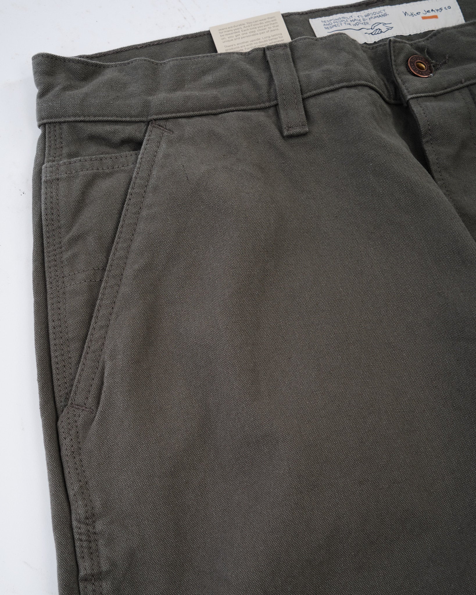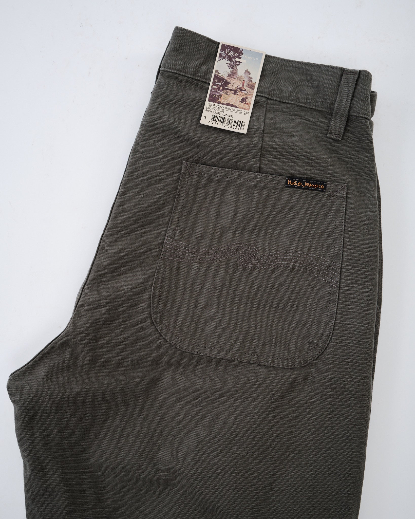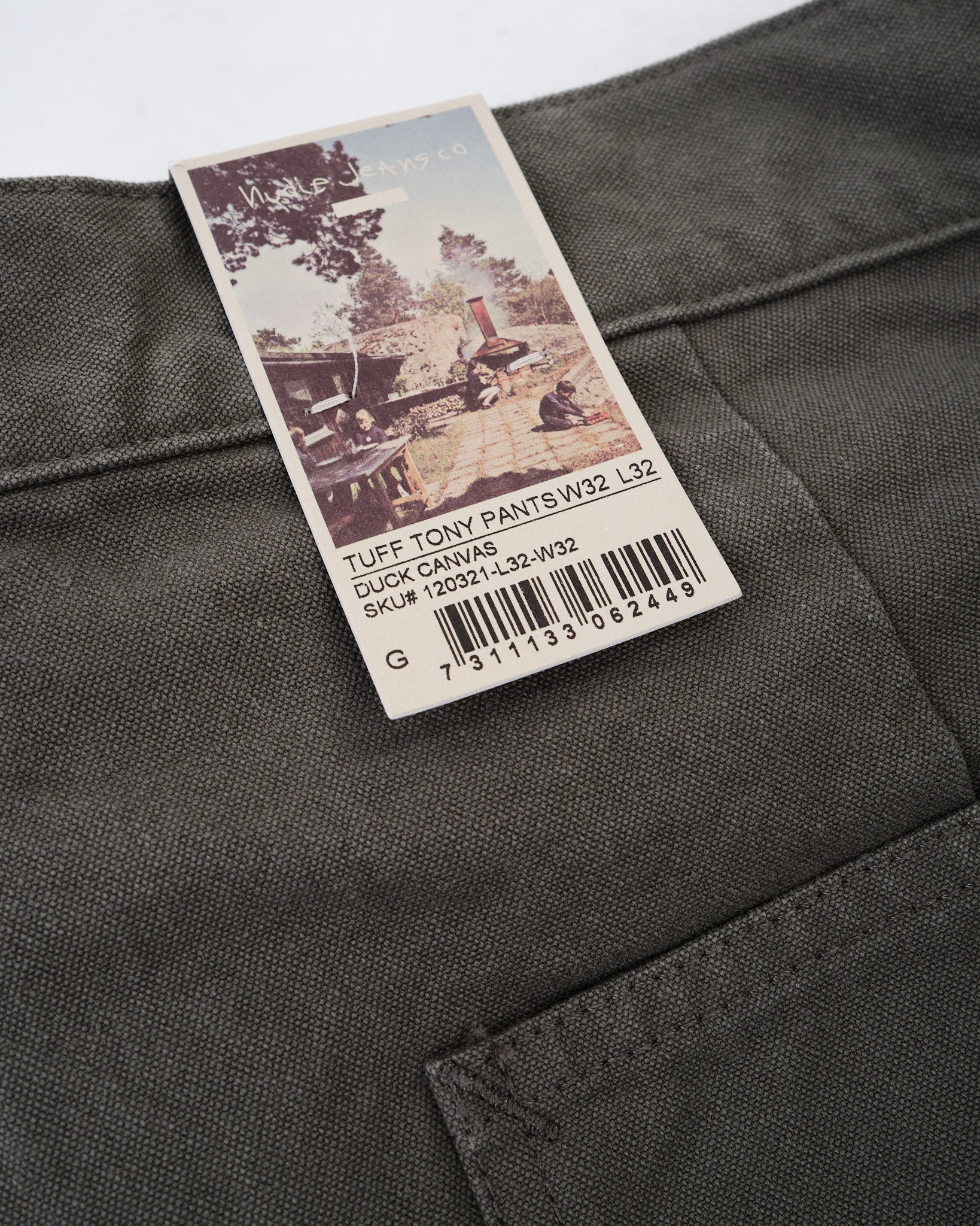 NUDIE JEANS CO. TUFF TONY PANTS DUCK CANVAS henkivät aitojen työvaatteiden olemusta, tarjoten väljän istuvuuden, leveät lahkeet ja mukavan korkean vyötärön. Inspiraationsa ne saavat 1900-luvun puolivälin vintage-metsästysvarusteista, ja housuissa on yksiväriset tikkaukset ja kupariset "Donitsi" napit, lisäten hienostunutta työvaatetunnelmaa ajattomaan siluettiin.