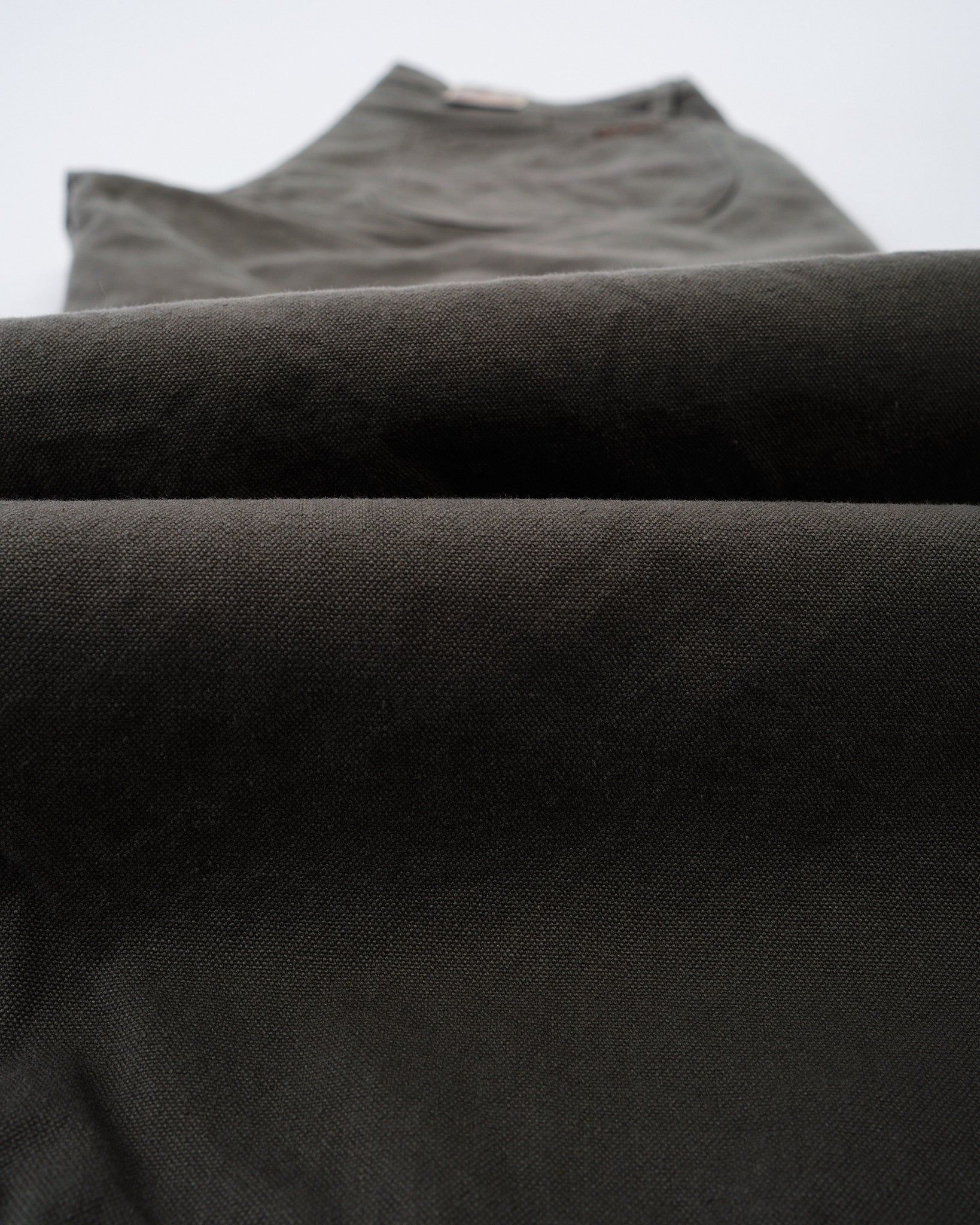 Valmistettu Duck Canvasista, joka on vaalean männynvihreä 2-säikeinen kudottu kangas, tämä kangas on kunnianosoitus perinteiselle käsityötaidolle. Käyttäen epäsäännöllisiä renkaaksi kehrättyjä lankoja, jotka on kierretty kestäviksi 2-säikeisiksi langoiksi, kangas on langanvärjätty patentoitua prosessia käyttäen, varmistaen rikkaan, kehittyvän patinan. Tiiviisti kudottu rakenne luo kiinteän, erittäin tekstuuripintaisen pinnan, juhlien luonnollisia epätäydellisyyksiä samalla kun se tarjoaa ylivoimaista kestävyyttä.