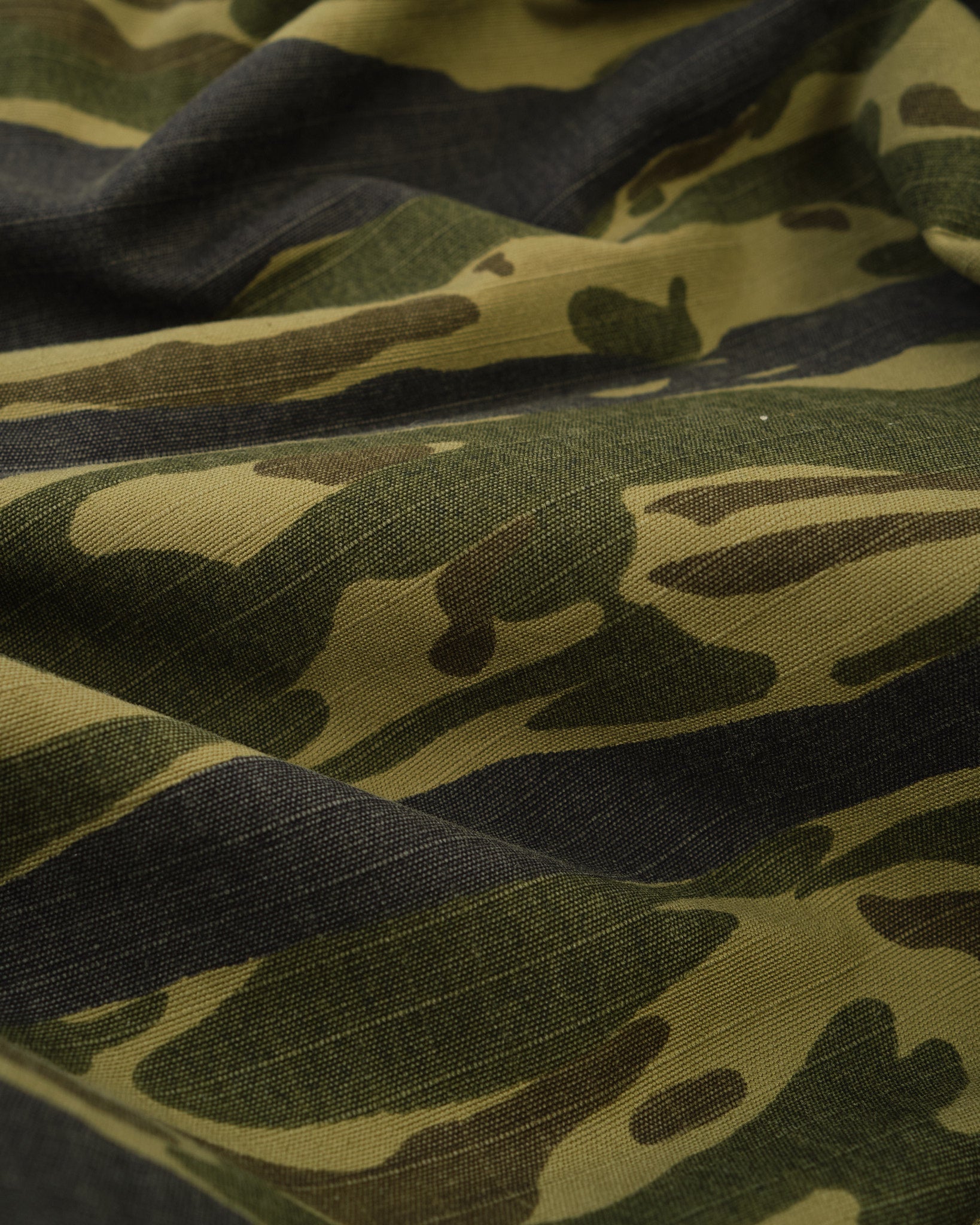 Erityisen huomionarvoinen on tiikerikuvio, joka on levitetty kulutusta kestävälle teksturoidulle puuvillalle, joka pehmenee käytössä samalla muotonsa säilyttäen. Säännöllinen suora-lahje istuvuus tarjoaa tilaa reidestä kevyellä kapenemisella polven alapuolelle hienostuneeseen sotilaalliseen siluettiin. Olipa kyseessä täyspitkänä tai käärittynä käytettävät housut, nämä ovat toiminnallisia housuja hieman villillä asenteella – klassinen orSlow, camo-twistillä.