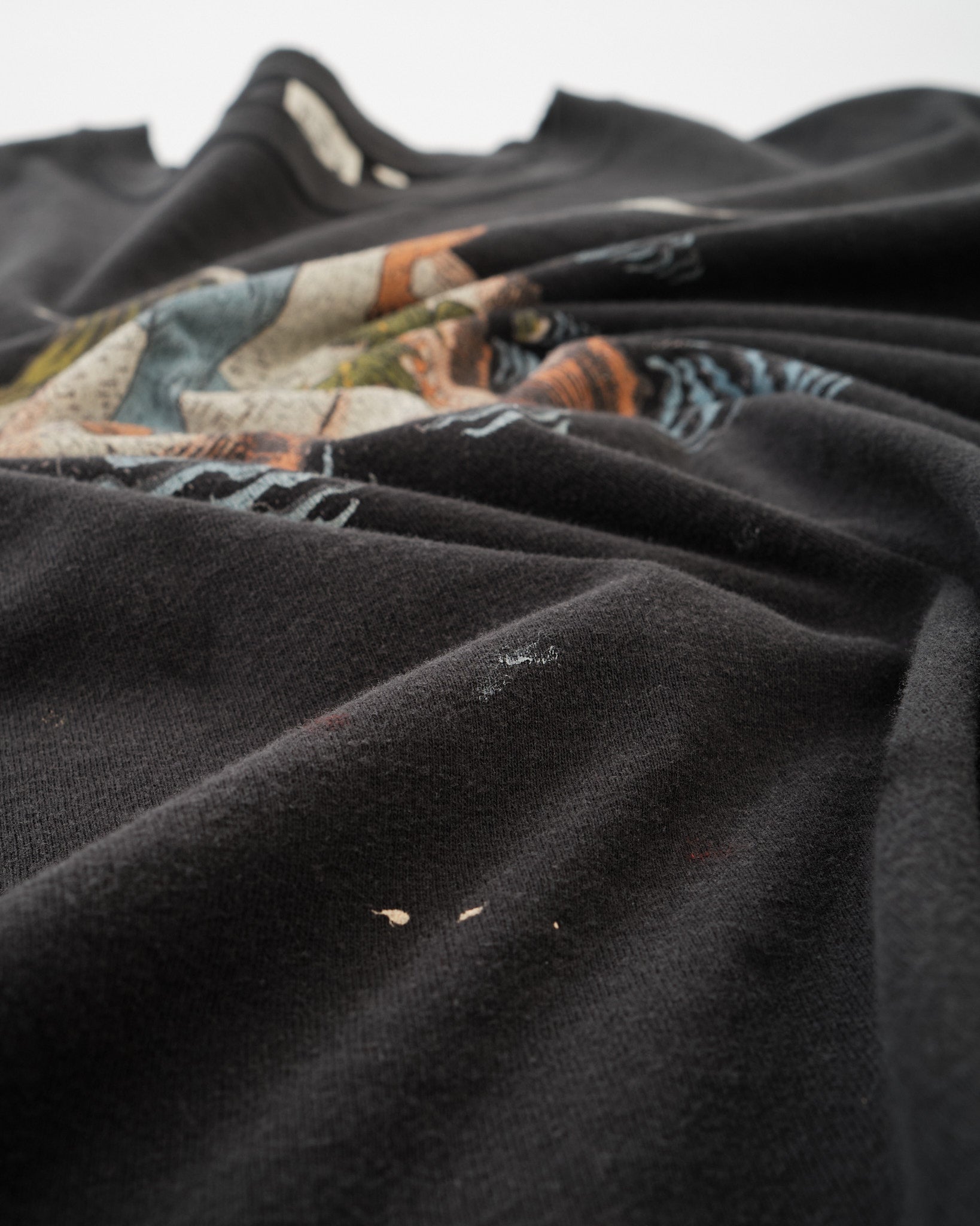 Valmistettu pehmeästä puuvillaneuloksesta, kankaalla on luonnostaan kulunut luonne, joka täydentää haalistunutta graafista painatusta. Havaiji-inspiroitu taide on tarkoituksella kulutettu, luoden aitoa, ajan patinoimaa ilmettä pikemminkin kuin terävää, vasta painettua ulkonäköä.