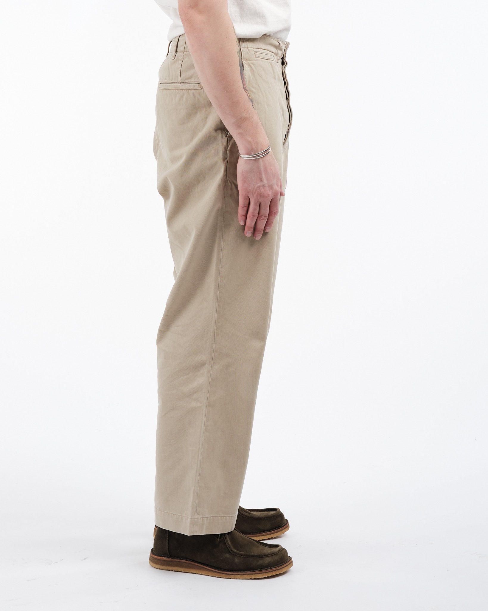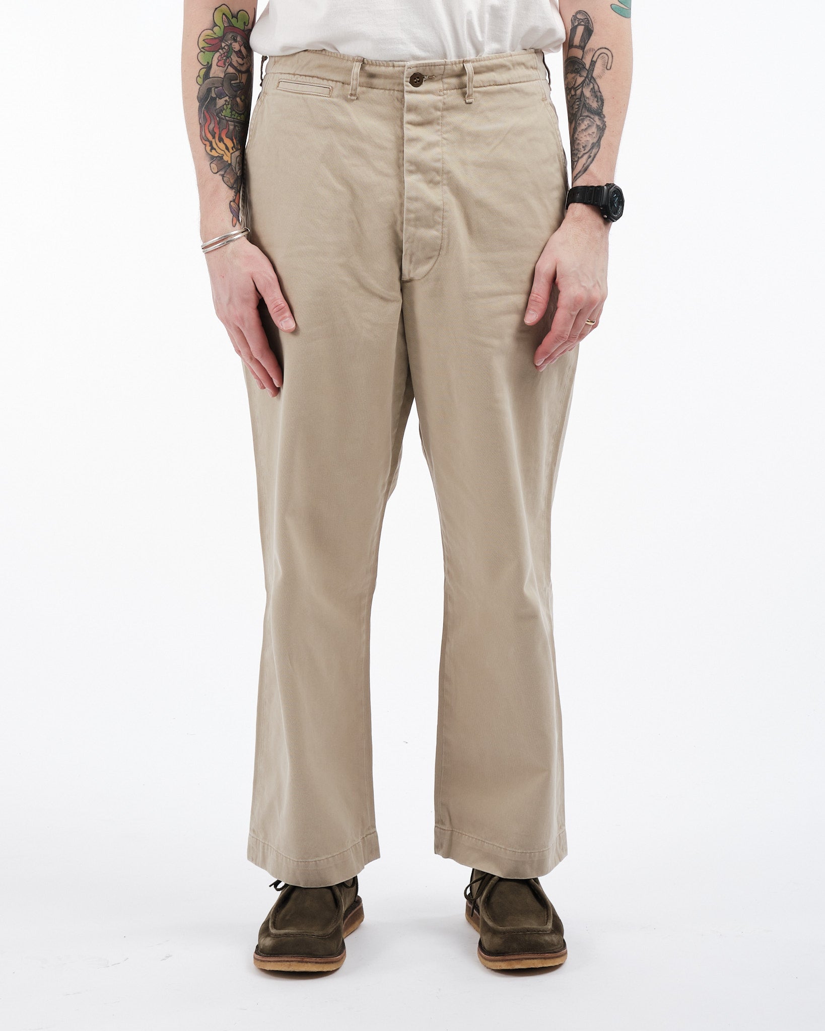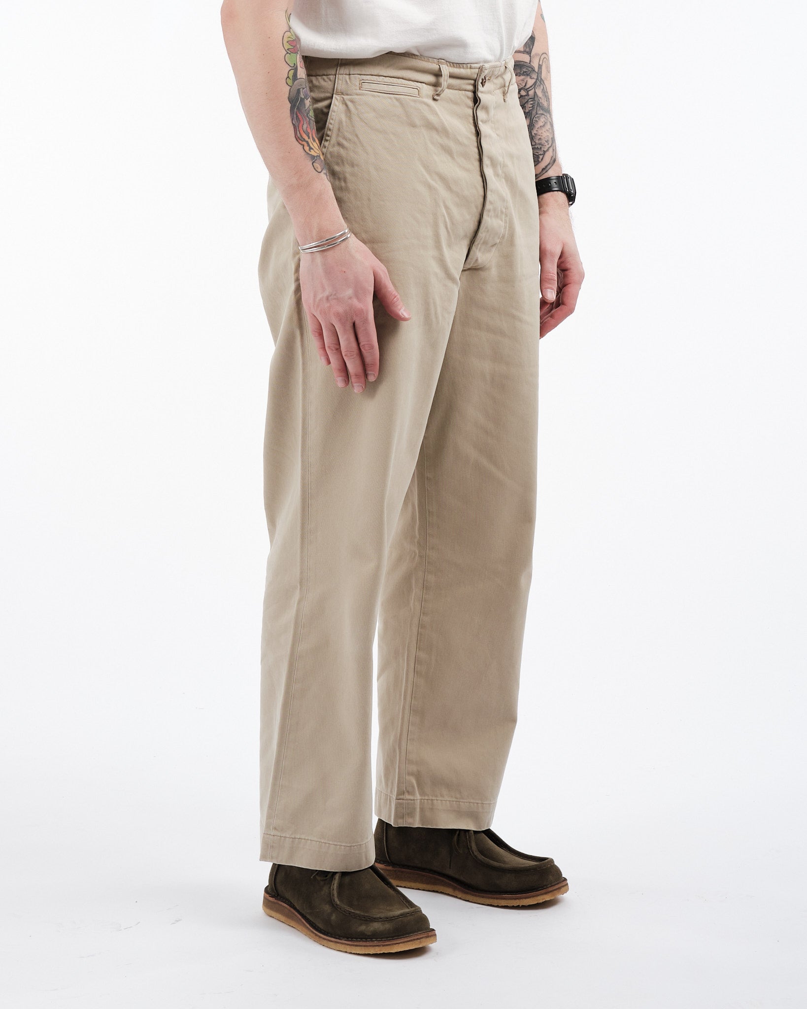 orSlow Vintage Fit Army Trousers in Khaki Stone Wash ovat moderni kunnianosoitus klassisille 1940-luvun Yhdysvaltain sotilaschinoille. Japanissa valmistetut housut on tehty kestävästä, tiiviisti kudotusta 100% puuvillachinokankaasta, mikä tarjoaa kestävyyttä ja mukavuutta. Vintage-malliin kuuluu korkea vyötärö ja leveät lahkeet, joissa on lievä kapenevuus, tarjoten rennon mutta rakenteellisen siluetin. Yksityiskohtiin kuuluvat napillinen sepalus, sivutaskut, kaksi takataskua ja kolikkotasku, jotka korostavat niiden utilitaarista viehätystä. Kivipesuviimeistely lisää käytetyn tuntua, tehden niistä monipuolisen lisän mihin tahansa vaatekaappiin.